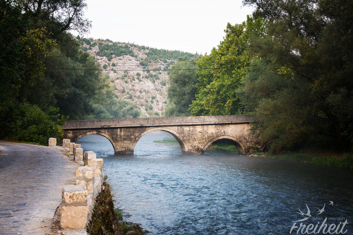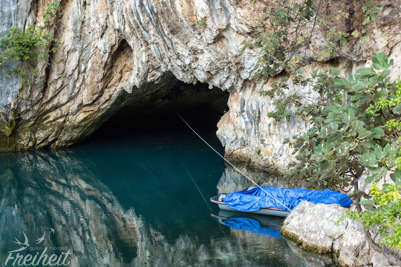 Es folgt nur noch der Abstieg und der Weg zurück zum Ort und zum Eko Centar, wo wir unsere Klettersteigsachen geliehen haben. Der Inhaber lädt uns direkt noch zum Kaffee ein und nach einem Schwätzchen geht es zurück zum Campingplatz, wo wir noch vor der Mittagshitze ankommen. Fazit: alles richtig gemacht mit dem Frühaufstehen :) Den Besuch der Buna Quelle verschieben wir auf den nächsten Morgen, um den Besucherströmen zuvor zukommen. Die Karstquelle zählt zu den größten Europas und ist die stärkste des Landes. Dazu liegt sie recht spektakulär in einer Höhle am Fuß einer 200m hohen Felswand. Aber auch das ist noch nicht alles. Einem türkischen Sultan hat es hier so gut gefallen, dass er im 18. Jahrhundert ein Derwischkloster direkt am Felsen und der türkisfarbenen Buna errichten ließ. Ein beliebtes Ausflugsziel nicht nur bei Einheimischen. Rund um den Fluss findet man ein Restaurant nach dem anderen und natürlich die obligatorischen Souvenirstände mit Kühlschrankmagneten und Schlüsselanhängern.