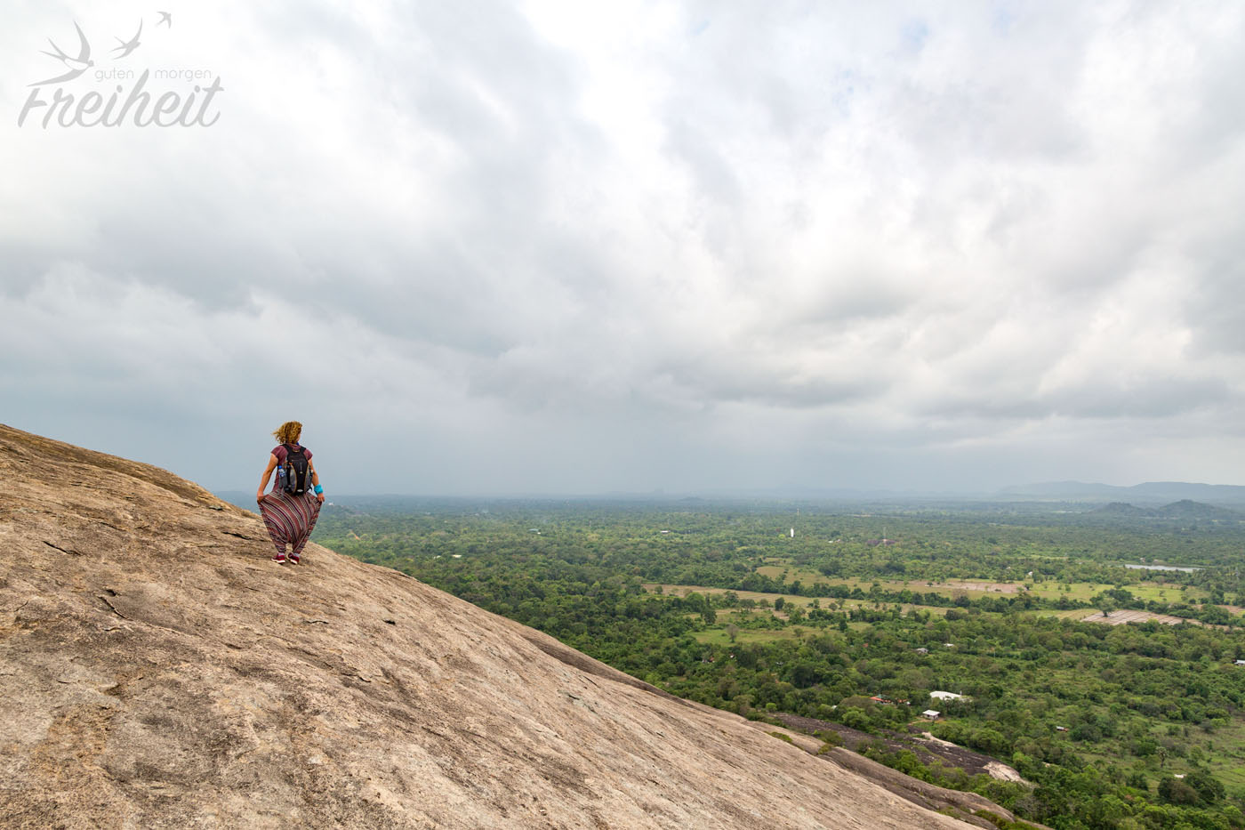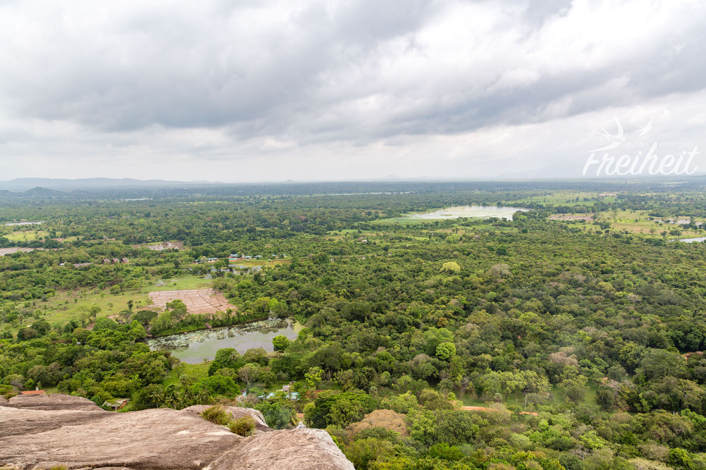 Außer uns sind nur eine Handvoll weiterer Touristen oben und auf dem Nachbargipfel Sigiriya scheint es richtig voll zu sein. Wir sind uns einig: richtige Entscheidung und voll schön hier oben! Nur eine halbe Stunde später zieht zügig von Süd-West eine Regenfront auf. Dann mal nix wie runter. Der Wind nimmt zu und noch bevor wir die Buddha-Statue erreichen regnet es. Zeit für eine kleine überdachte Rast mit Bananen und leckeren Kokoskeksen 🙂