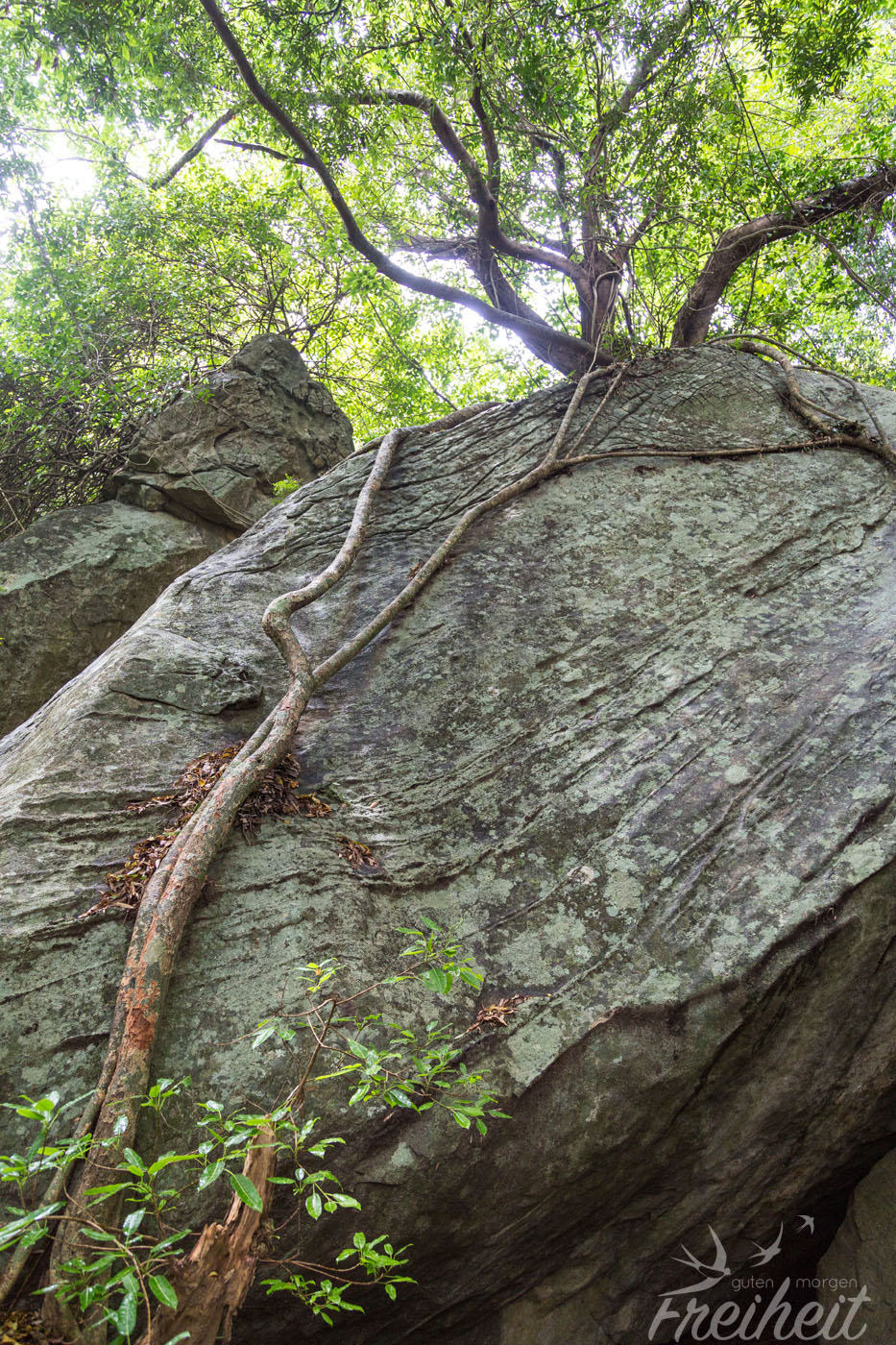 Der Aufstieg sei steil, anspruchsvoll und lang – wie sollen aufpassen. Er dauert mindestens eine Stunde und wir sollen reichlich zu trinken mitnehmen. Der schön angelegte Weg ist großteils schattig und geht recht flott rauf. Wir kommen am liegenden Buddha vorbei, sehen noch eine kleine Schlange beim Fischfang und nach einer kurzen Kraxeleinlage sind wir schon nach 30 Minuten auf dem Gipfel und erfreuen uns an dem Blick auf Sigirya und den 360 Grad Ausblick. Witzig, die Anreise dauert dreimal so lange wie angekündigt und für den Aufstieg benötigen wir nur die Hälfte der Zeit 🙂