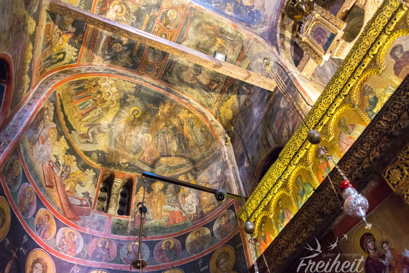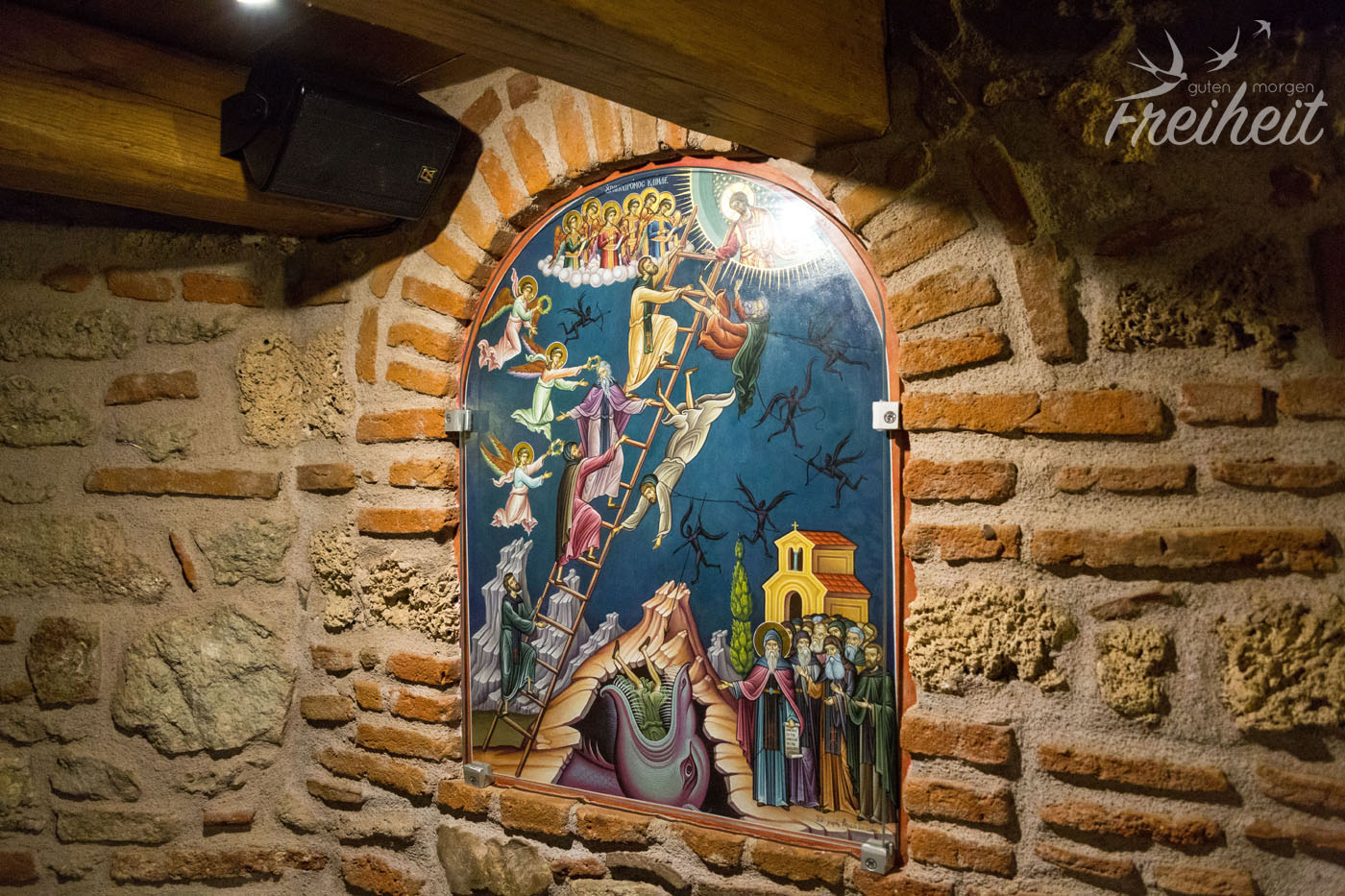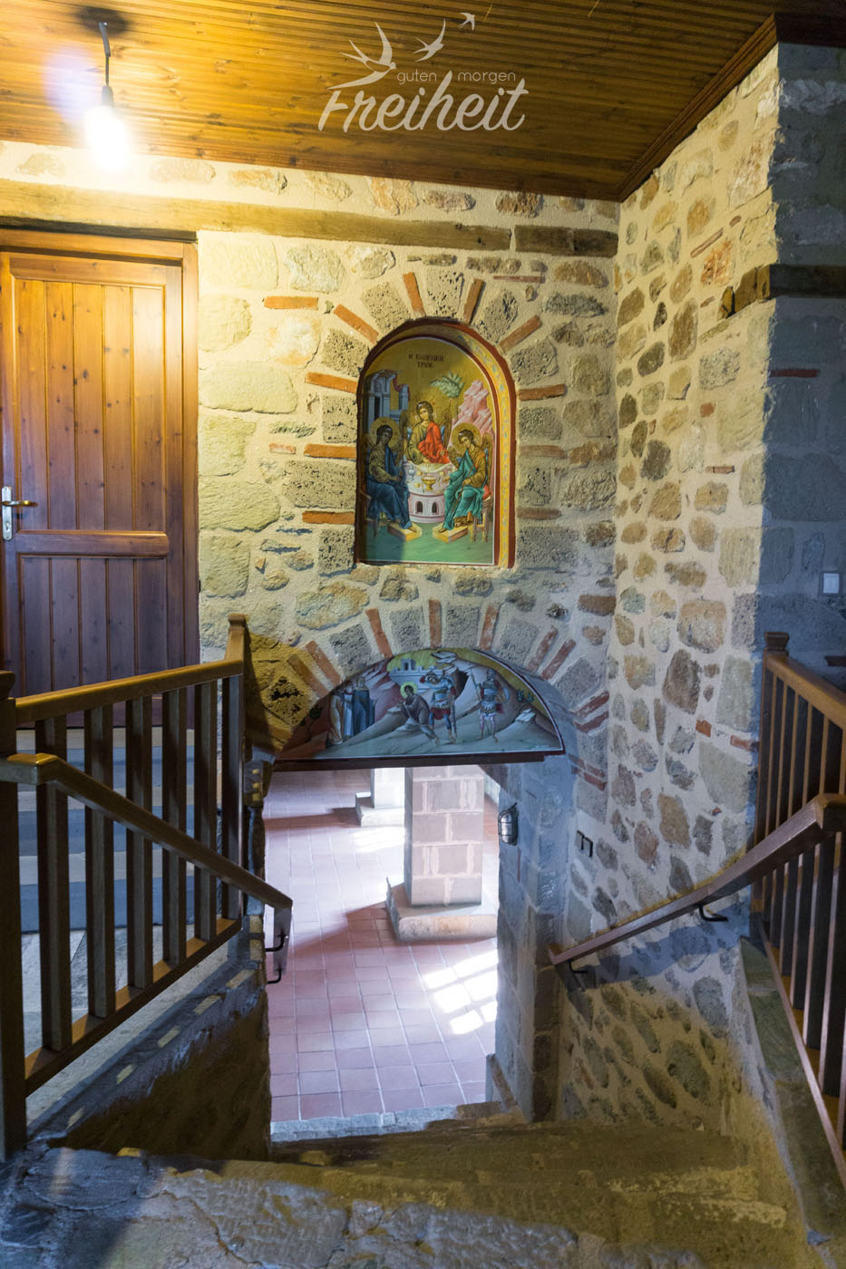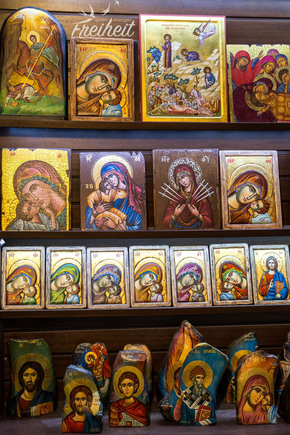 Unser drittes und letztes Kloster. Fast wollte Carsten nicht mehr mitkommen, denn schon von weitem sehen wir den Besucherstrom, der sich über die Treppen nach oben windet. So langsam wird es wohl voll in den Klöstern. Kaum vorstellbar wie es hier in der Hochsaison aussieht. Das Kloster ist deutlich größer als die anderen beiden und neben einer Kapelle gibt es noch eine Doppelkreuzkuppelkirche (heißt wirklich so), einen freistehenden Glockenturm, eine alte Seilwinde und andere Reliqien zu besichtigen. Ebenfalls einen Platz gefunden, hat ein kleiner Shop, der jede Menge buntglänzende Ikone verkauft. In der orthodoxen Kirche sind Ikone extrem wichtig. Abgebildet sind Heilige und jeder für sich wird von den Gläubigen zu unterschiedlichen Anlässen angebetet und geküsst. Es gibt eine Ikone für Frauen, die schwanger werden wollen, eine Ikone für eine gute Ernte und ganz bestimmt auch eine Ikone für guten Wein 😉