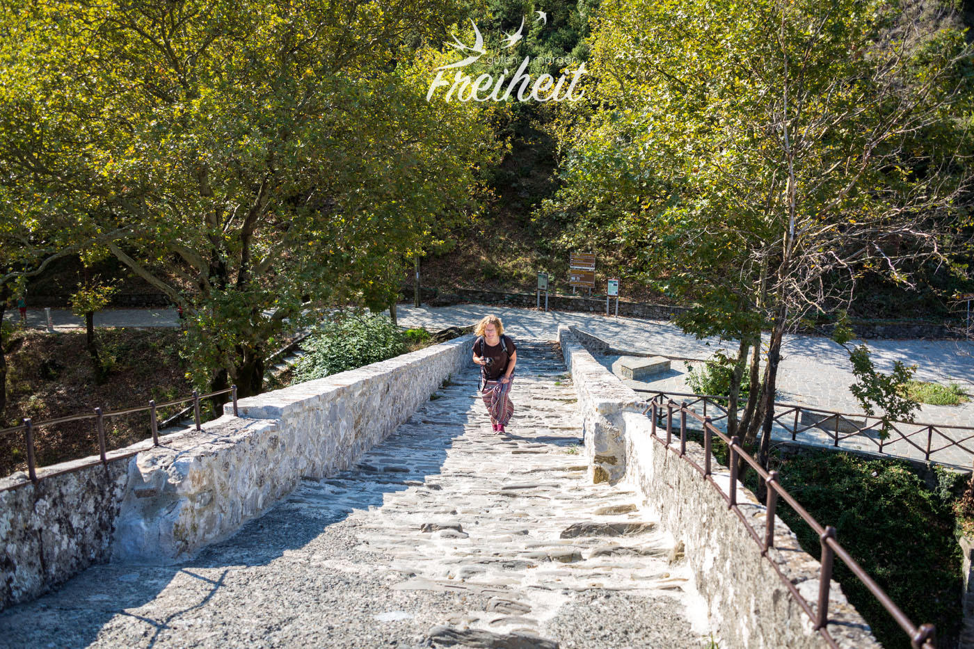Wir versprechen ihm alles anzuschauen – denn mit weniger wäre er nicht zufrieden gewesen – und widmen uns dann dem einzigen wirklich interessant klingenden Punkt auf der Karte. Eine alte einbögige Steinbrücke im Örtchen Konitsa, die sich über den Fluss Aoos schwingt und mit einer Höhe von 20m und einer Länge von 40m zu den größten Brücken ihrer Art im ganzen Balkan gehört. Immer diese Superlativen ;-P Spannender ist, dass fast 50 Jahre an der Brücke gebaut wurde bis sie 1871 endlich fertig gestellt wurde. Anscheinend wollte man die damals hier herschenden Osmanen mit der Größe des Bauwerks beeindrucken.