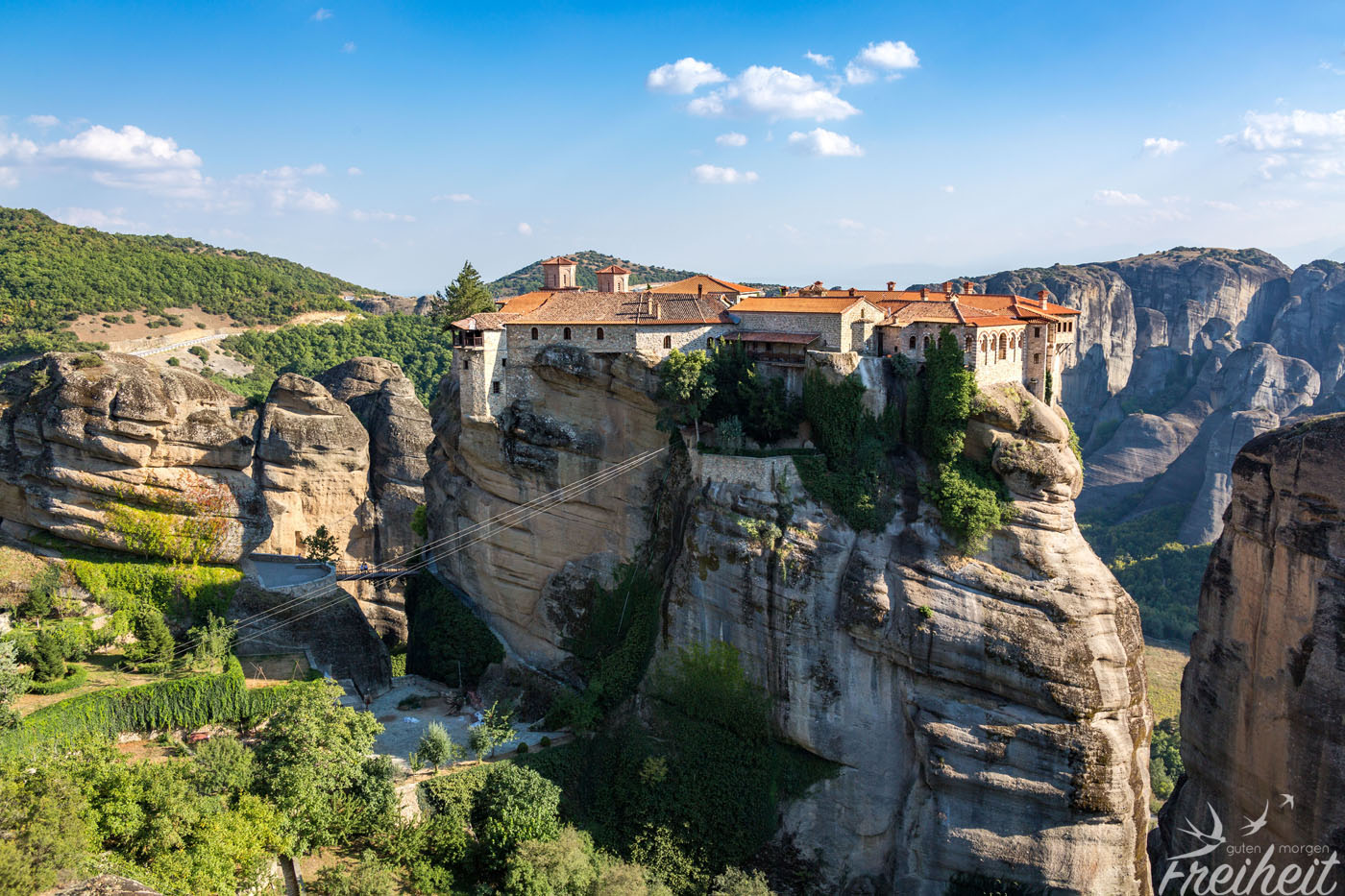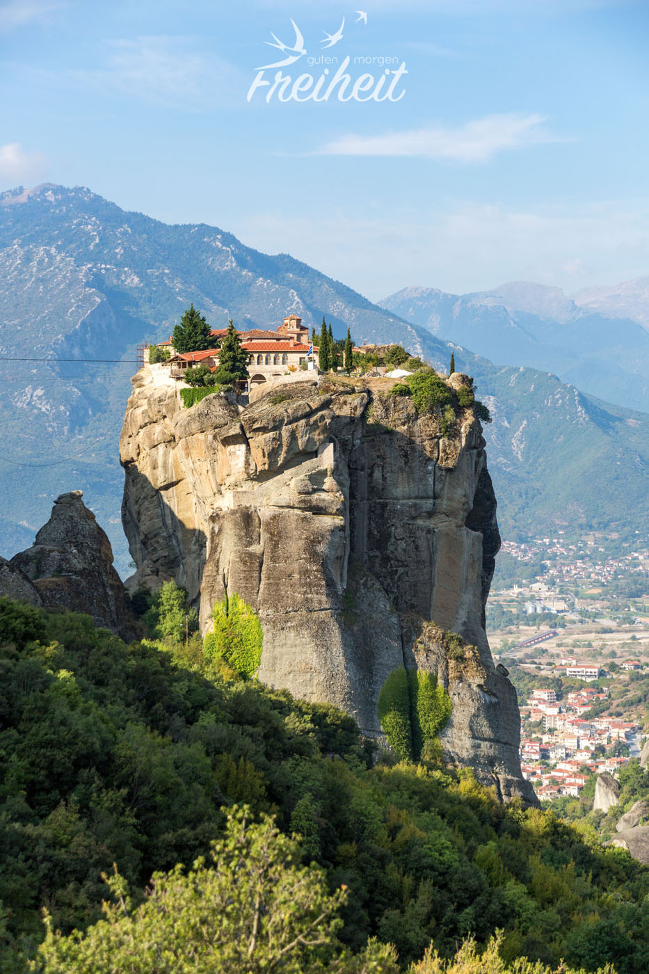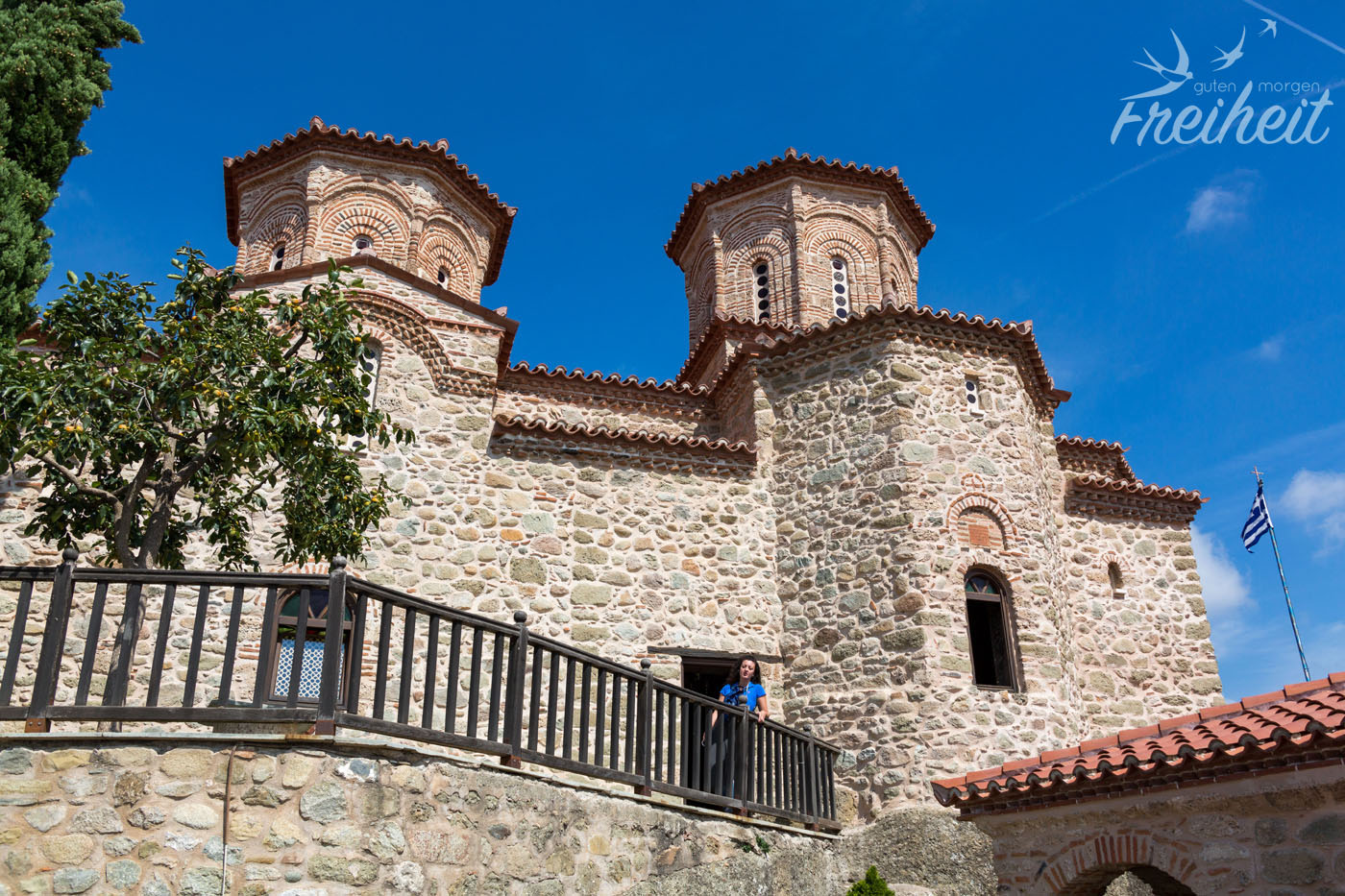 Von weitem sieht das Kloster extrem spektakulär und exponiert aus. Es thront auf dem Gipfel eines breiten Felsens, der neben der Klosteranlage sogar noch Platz für einen Gemüsegarten und eine großzügige Terrasse bietet. Von hier oben hat man einen hervorragenden Ausblick über die Stadt Kalambaka. Und für alle Filmnerds: an dieser Stelle fand das Finale von „James Bond: In tödlicher Mission“ statt 😉