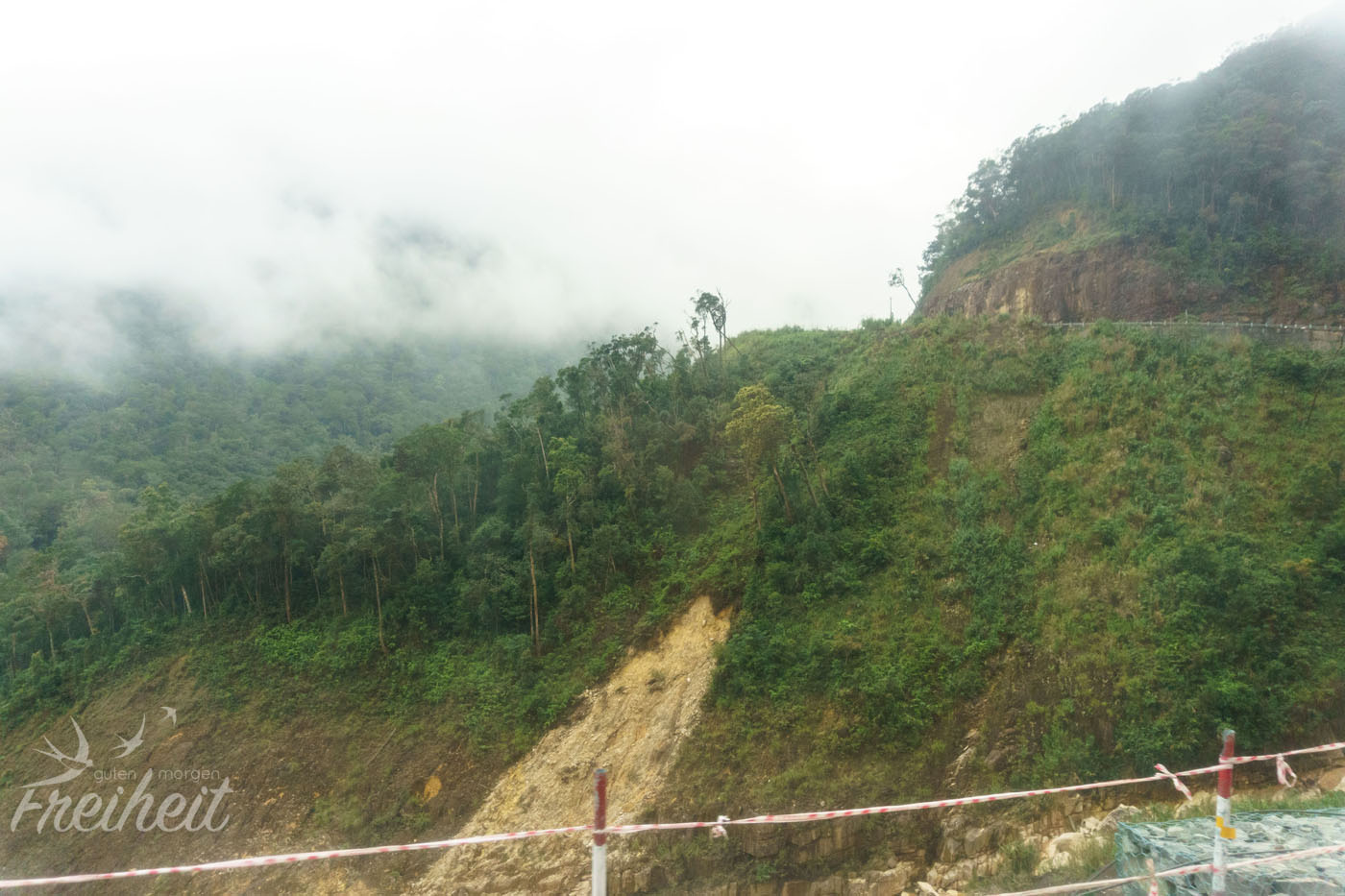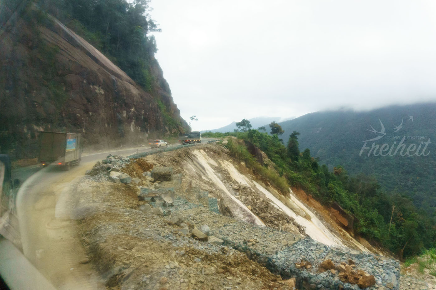 Nach ungefähr zwei Stunden wäre eine Toilettenpause nötig, statt dessen stehen wir leider im Stau auf einer Bergstraße. Immer mehr Menschen verlassen ihre Fahrzeuge und auch unser Fahrer öffnet die Tür und stellt einen Eimer mit Flip Flops hin. Leihschuhe vom Busunternehmen. Eigentlich ganz cool, aber leider ziemlich verdreckt. Die Männer verlassen den Bus und stellen sich gleich in eine Reihe neben den Bus an den Straßenrand. Nach ein paar Minuten suche auch ich mir einen Platz, nur etwas abseits, soweit möglich. Nadine und alle anderen Frauen sind sitzengeblieben und halten ihre Blase an. Das ist mega ätzend, denn die Schaukelei und die Schlaglöcher drücken mächtig auf die Blase und normalerweise haben die Busfahrer immer zeitig eine Pause an einer Raststation eingelegt. Nicht diesmal. Zwei Frauen hocken sich auch an den Straßenrand (Gebüsche gibt es nicht), der Druck war zu groß. Nach einer halben Stunde geht es langsam weiter. Eine Baustelle mit Sprengarbeiten sorgte für Unterbrechungen. Die Landschaft ist grandios. Tiefe Täler, Schluchten und Muren umgeben von gaaanz viel Grün.