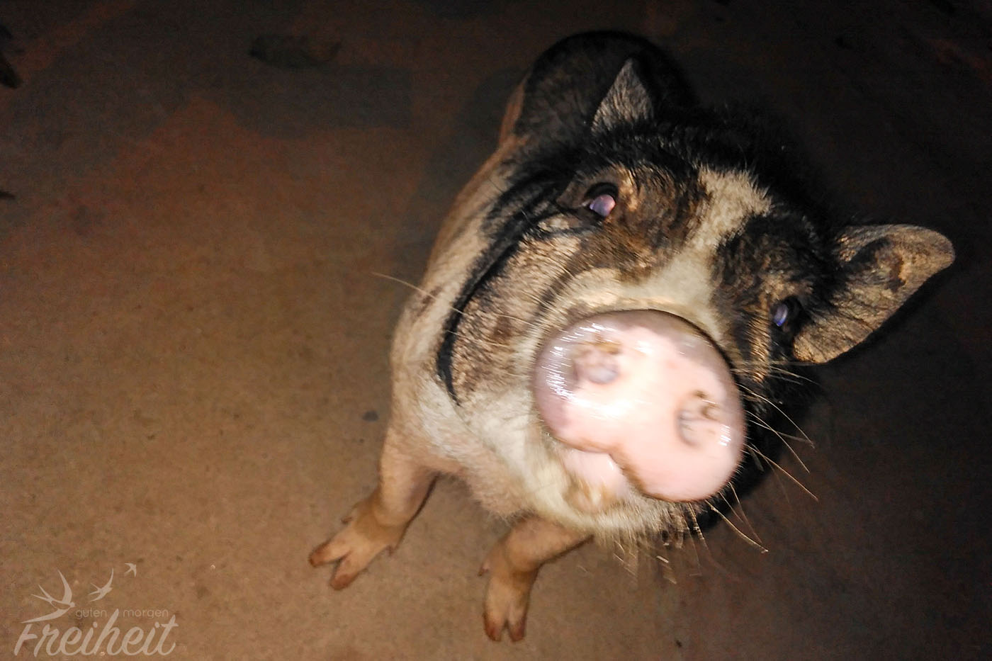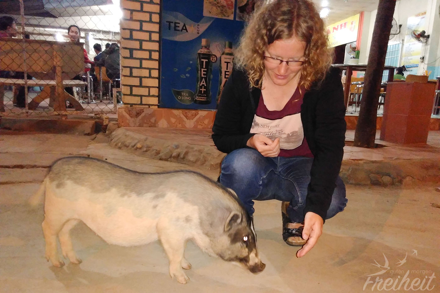 Gegen 18.00 Uhr erreichen wir ein recht großes Strassenrestaurant, was üblicherweise von Reisebussen angefahren wird. Ausreichend Toiletten und eine gut organisierte Küche sorgen für einen reibungslosen Ablauf. Selbst wir zahlen keine Tourimondpreise und werden nett versorgt. Sogar Kekse bekommen wir zum Normalpreis angeboten. Während wir so dasitzen und essen, läuft ein süßes rosa Schwein von Tisch zu Tisch und wird teilweise gefüttert. Mit feuchter Schnauze und neugierigen Augen sollte es eigentlich jedes Herz erweichen.