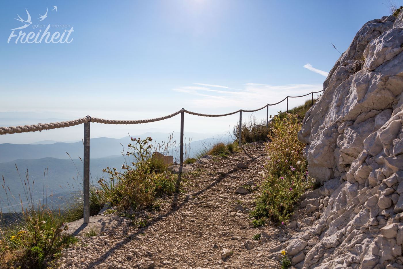 Eine kurze 10-minütige Wanderung führt die Besucher einmal um den Gipfel herum. So sehen wir sowohl die karge Seite zur Küste im Osten hin, als auch die grünere Seite des Gebirges zum Westen hin. Eine beeindruckende Landschaft! Und der Fernblick reicht weit. Wir sehen sogar die stark langgezogene Insel Hvar am Horizont.
