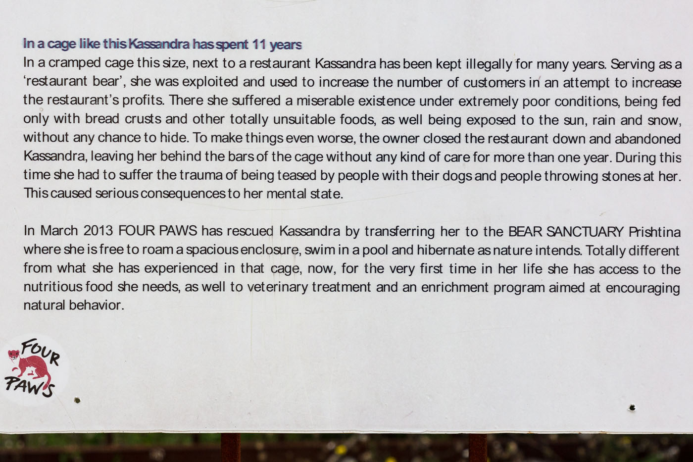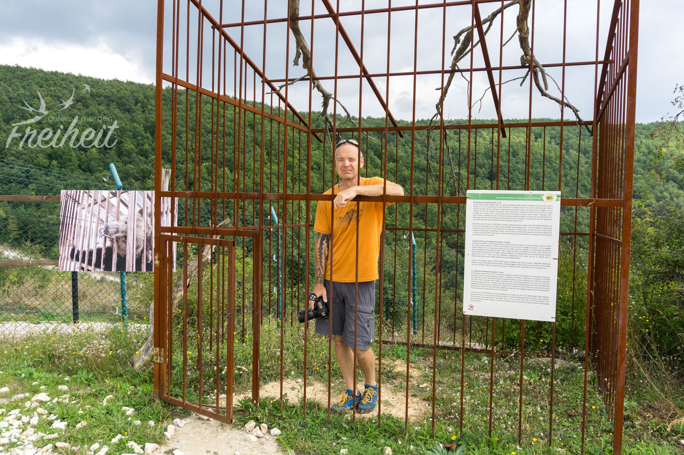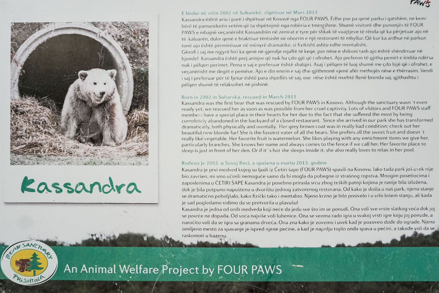 Nach diesem Schauspiel trotten die beiden Bären aus unserem Sichtfeld und wir schauen uns die anderen Gehege an. Die meisten Bären scheinen zu schlafen. Nur einen sehen wir noch direkt am Zaun liegen. Immer wieder sind die Geschichten der einzelnen Bären am Gehege befestigt. Auch ein Original Käfig aus der Restaurant Zeit der Bären ist neben den traurigen Bildern aus der Gefangenschaft aufgestellt. Der Bärenpark ist „ein Ort der Hoffnung – nicht nur für Bären“ so tituliert es das Münchener Abendblatt. Ein lesenswerter Bericht, der auch auf die noch immer schwierige Situation zwischen den verschiedenen Ethnien des Kosovos eingeht. Wir jedenfalls sind sehr glücklich die geretteten Bären sehen zu dürfen. Es sind erstaunliche Geschöpfe und wir hoffen sehr, dass auch in Albanien die „Tradition“ der Bärenrestaurants ein Ende findet. Wer mit seiner Stimme helfen mag – hier geht es zur Petition von Vier Pfoten.