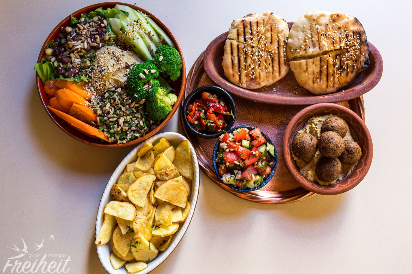 Nach dem Einchecken machen wir uns auf die Suche nach einem kleinen Lokal, dass uns HappyCow empfohlen hat. Nix wie hin. Google Maps führt uns ein wenig an der Nase herum, Anwohner versuchen uns, leider erfolglos, hinzuführen. Also versuchen wir noch einmal den eigentlich Zielort einzukreisen 😉 Mit Zielstrebigkeit, offenen Augen und einer guten Portion Glück werden wir in einer kleinen hinteren Ecke eines kleinen Seitenwegs einer kleinen Seitenstraße fündig 🙂 Und das Suchen hat sich gelohnt. Leckere Falafal Bowl mit frischem Gemüse, Pitabrot, Salaten und und und. Mehr als genug.