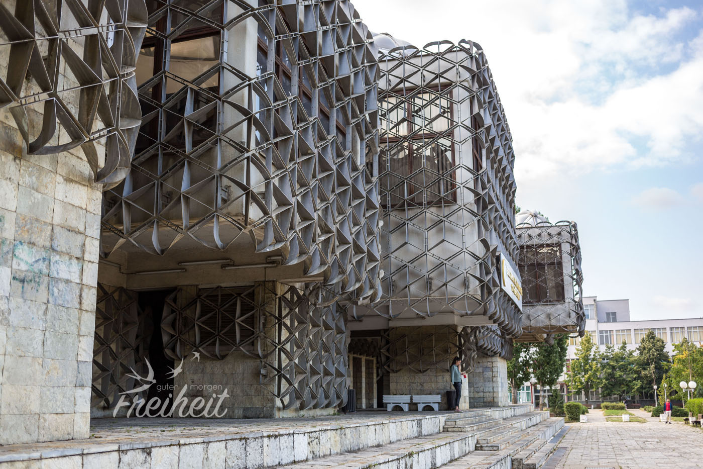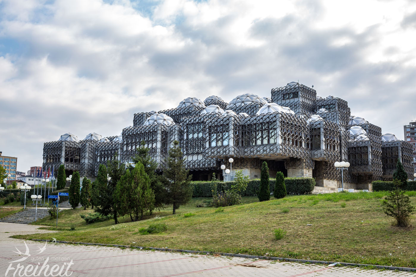 Am nächsten Morgen besichtigen wir die neugebaute katholische Kathedrale der Seligen Mutter Teresa. Von innen ungewohnt wenig protzig. Sehr angenehm. Besonders weil sie von privaten Spendengeldern errichtet wurde und nicht aus der Staatskasse. Weiter gehts zum Newborn Denkmal, dass 2008 zum Tag der Unabhängigkeitserklärung Kosovos enthüllt wurde. Das Erscheinungsbild der drei Meter hohen Buchstaben wechselt und da aktuell 10jähriges Jubiläum gefeiert wird, wurde der Buchstabe B durch eine 1 ersetzt, so dass sich die Zahl 10 im Schriftzug „versteckt“. Weiter geht es zum außergewöhnlichsten Gebäude. Die Nationalbibliothek des Landes hat zwar schon den Preis des hässlichsten Gebäudes der Welt „gewonnen“, aber Geschmäcker sind bekanntlich verschieden. Wir finden es ziemlich spannend. Besonders aus der Ferne sieht es sogar recht modern aus. Von nahem enthüllt es aber sein wahres Alter und sieht ziemlich heruntergekommen aus.