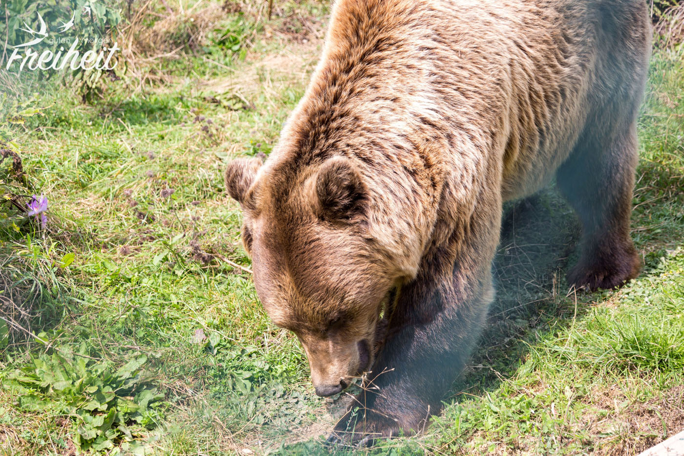 Die Bärengehege sind doppelt gesichert und neben einem elektrischen Zaun gibt es noch einen zweiten meterhohen Maschendrahtzaun. Sieht aus wie im Hochsicherheitstrakt eines Gefägnisses. Aber Auflagen sind Auflagen und ohne die Erfüllung selbiger gäbe es auch keinen Bärenpark.