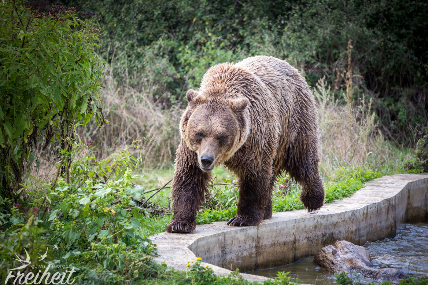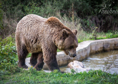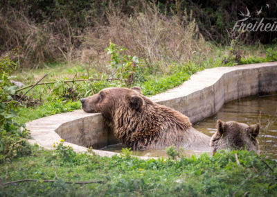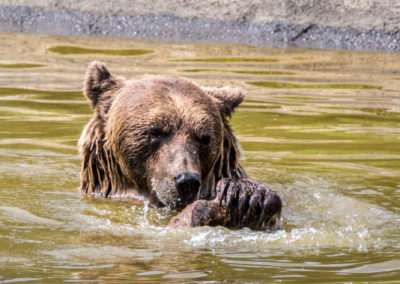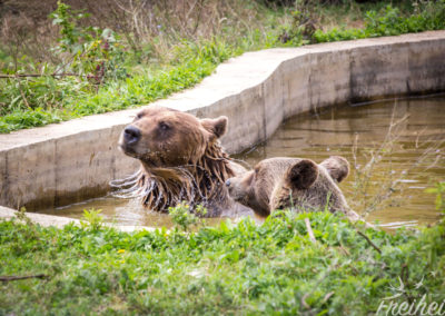 Na gut, dann versuchen wir es bei den Freigehegen. Und juchhuu…. das Glück ist uns hold. Gleich zwei Bären direkt am Zaun! Und soooooo plüschig und süß! 😀 Das Fell glänzt und sieht so flauschig aus, dass man es am liebsten streicheln möchte. Kein Wunder, dass Teddybären die liebsten Kuscheltiere sind! Wir beobachten die zwei und verfolgen jeden ihrer Tritte. Irgendwann haben sie genug und entfernen sich vom Zaun. Wir bleiben. Und dürfen Zeugen von einem ausgiebigen Bärenbad werden!