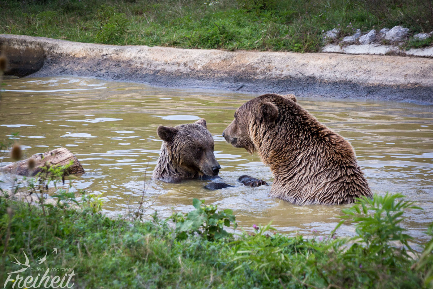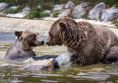 Das Weibchen und das deutlich größere Männchen scheinen sich gut zu verstehen. Oder doch nicht? Von einem auf den anderen Moment richtet sich die Bärenlady auf und verpasst dem Herren ein paar Ohrfeigen. Der wiederrum lässt das nicht auf sich sitzen und verteilt ebenfalls ein paar Watschen. Die Mäuler sind weit aufgerissen und entblößen spitze Zähne. Das Wasser spritzt in alle Richtungen. So schnell wie es anfing, so schnell hört es wieder auf. Das Spiel wiederholt sich noch zweimal. Irgendwann verlässt das Männchen das Badebecken, schüttelt sich das Wasser aus dem Fell und trottet langsam davon. Alleine Baden ist ja irgendwie blöd und so schwimmt das Weibchen schnell ans Ufer und folgt ihm. Er dreht sich zu ihr um und hockt sich auf die Hinterbeine. Kaum angekommen, richtet sich das Weibchen auf und verpasst dem nun gleich großen Artgenossen wieder ein paar mit den Pfoten. Das Kräftemessen geht weiter. Während Carsten fleißig ein Foto nach dem anderen schießt, halte ich diesen „Kampf“ per Video fest. Die Bilder sehen übrigens viel schlimmer aus, als es in Echt war. 😉 Ob die beiden grad anbändeln? Nach dem Motto: „Was sich liebt, das haut sich“? 😀