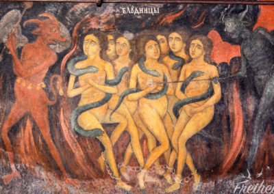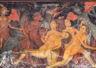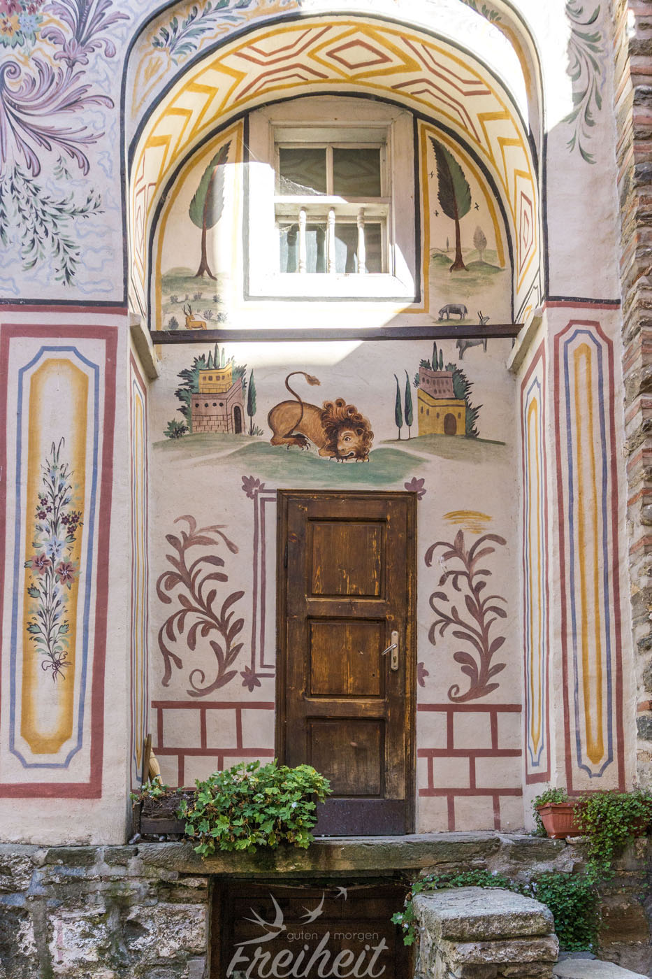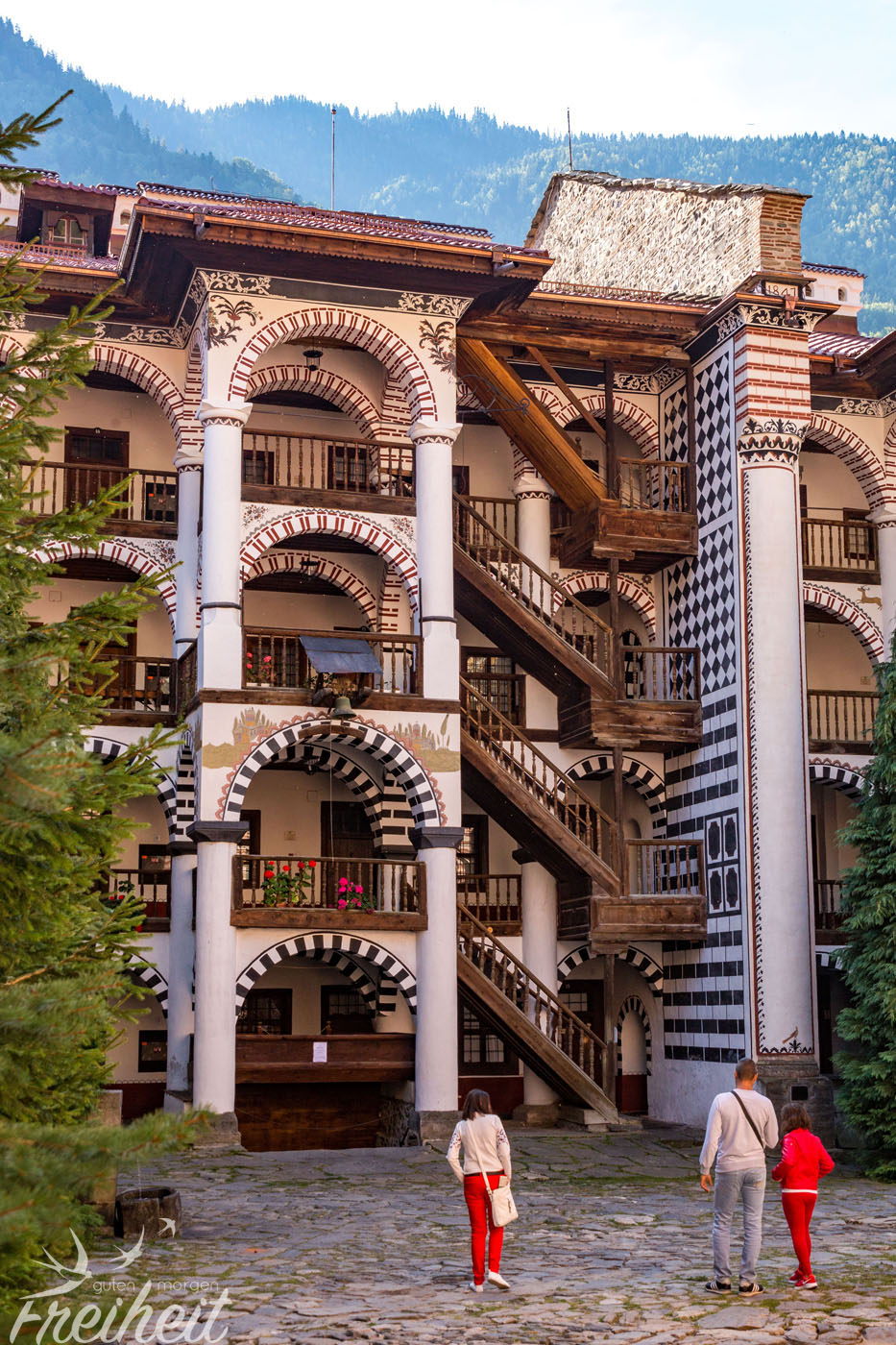 Nach einer weiteren halben Stunde kommen wir am Parkplatz des Rila Klosters an. Frisch ist es. Kein Wunder. Immerhin sind wir auf fast 1200 Meereshöhe und die Sonne muss erst noch ein bisschen höher klettern um die Schatten zwischen den hohen Bergen verschlucken zu können. Es ist halb zehn als wir das (kostenlos zu besichtigende) Rila Kloster betreten. Begrüßt werden wir von meditativen Gesängen, die aus der Kirche zu kommen scheinen und über Lautsprecher verstärkt werden. Wir stehen im großflächigen Innenhof der Klosteranlage. Mitten im Zentrum steht die Klosterkirche Sweta Bogorodiza, die als Bulgariens beutendste Klosteranlage gilt. Zu Recht wie ich finde. Ich kenne kein Gebäude zu dem ich einen Vergleich ziehen könnte. Vorallem kein bunteres 😉 Ich (Carsten weniger) bin sehr beeindrukt – sowohl von der Architektur als auch von den hunderten farbenprächigen Freskenzeichnungen.