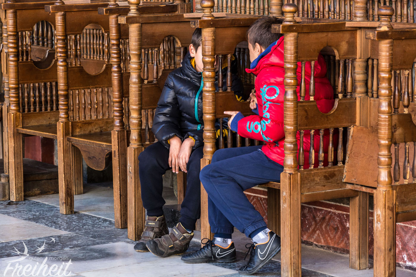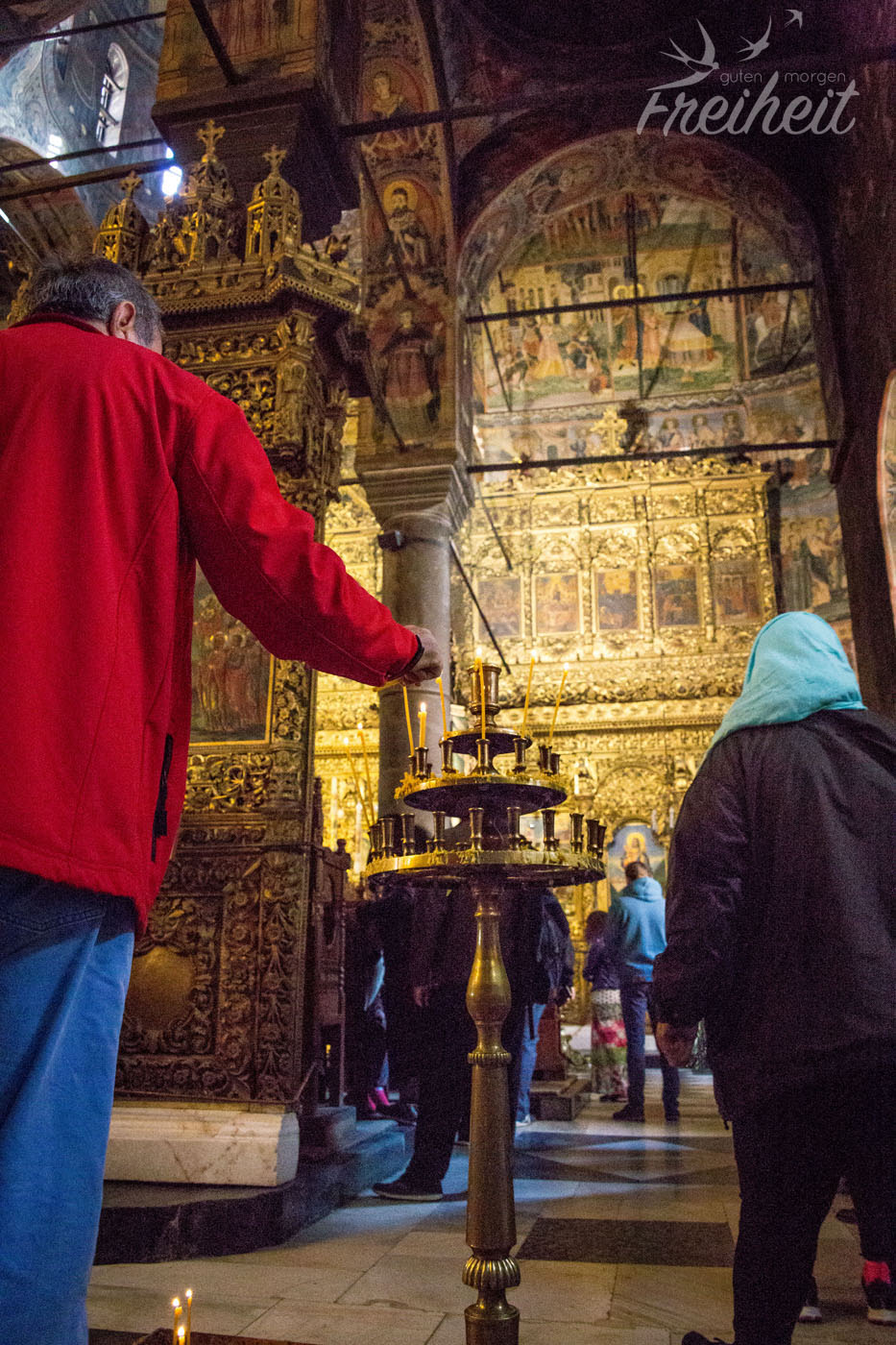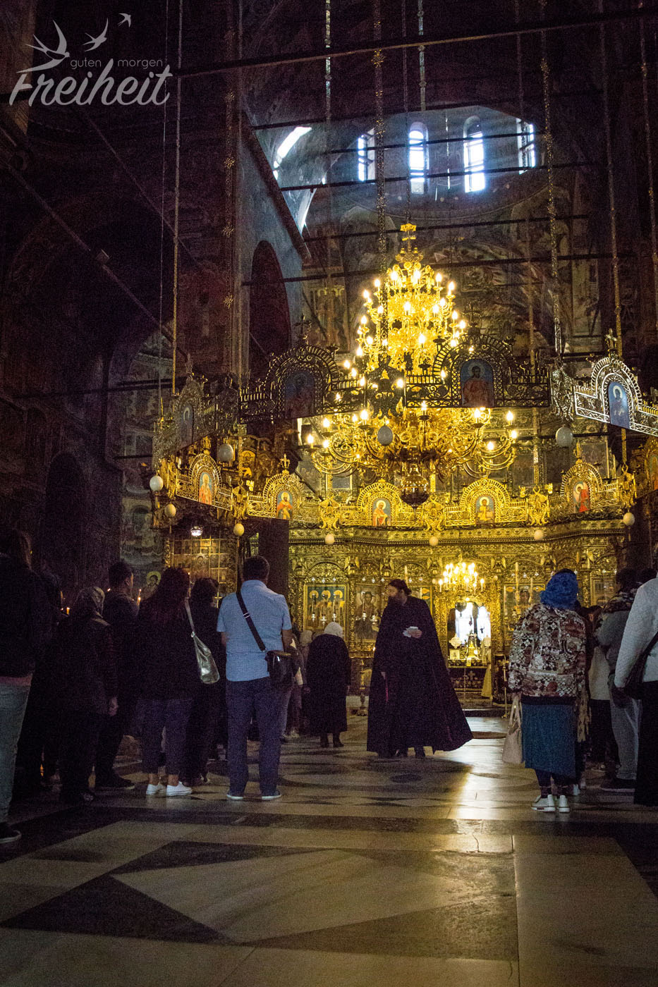 Wir betreten das Kircheninnere und staunen. Nicht nur wegen der riesigen Wand voller Ikonen (der Ikonostase) und dem vielen Gold, Gold, Gold! Auch der Patriarch und seine Anhänger, die einer genau einstudierten Choreographie vor der Ikonostase folgen, lassen uns staunen. Die sehen aus, wie der Papst bei der Krönung! Weiße reich bestickte Umhänge, riesige Krone auf dem Kopf und Goldschmuck um den Hals. Da bleibt einem glatt die Spucke weg. Gegeizt wird hier nicht. Was für ein Gottesdienst! Oder wie auch immer man das hier nennt ;-P Dazu die Gesänge in Dauerschleife und die Gläubigen, die wie auf Kommando immer wieder die Köpfe neigen. Unglaublich spannend die Geschehnisse zu beobachten, auch wenn es etwas sektenartiges an sich hat.