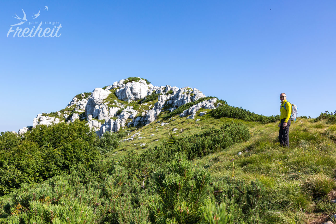 An einem Abzweig bieten sich uns zwei Varianten zum Gipfel des Snjeznik an. Von der Zeit her ähnlich lang, einer dafür etwas sportlicher und steiler hinauf, – den nehmen wir 😉 Die letzte halbe Stunde geht nun abwechslungsreich über Stock und Stein und der Wald lichtet sich. Sogar eine kleine leichte Kraxeleinheit wartet kurz unterm Gipfel auf uns!