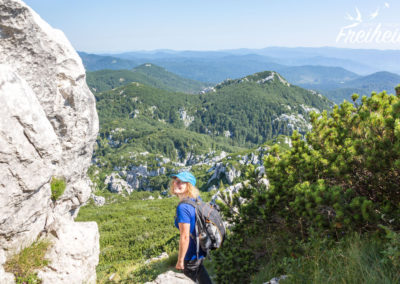 Oben angekommen auf dem Snjeznik (1509m) haben wir einen schönen rundum Blick über die Täler und auf die Nachbargipfel. Und auch von hier oben sieht es aus wie im Schwarzwald. Kroatien scheint hauptsächlich aus Wald zu bestehen, kein Wunder, dass die Holzindustrie hier eine traditionell große Rolle spielt. Wir geniessen den freien Blick und machen nicht nur Fotos sondern auch eine stärkende Brotzeit. Es ist fast nicht zu glauben, auf dem gut zu erreichenden zweithöchsten Gipfel des Nationalparks sind wir mitten in der Hochsaison allein. Stören tut es uns nicht, aber wunderlich ist es schon.