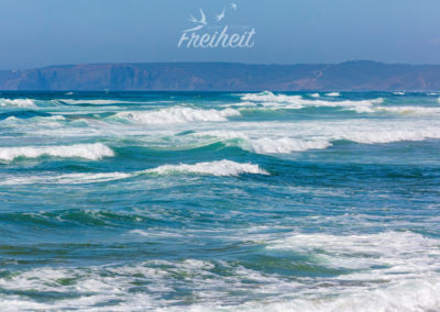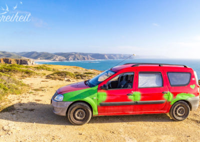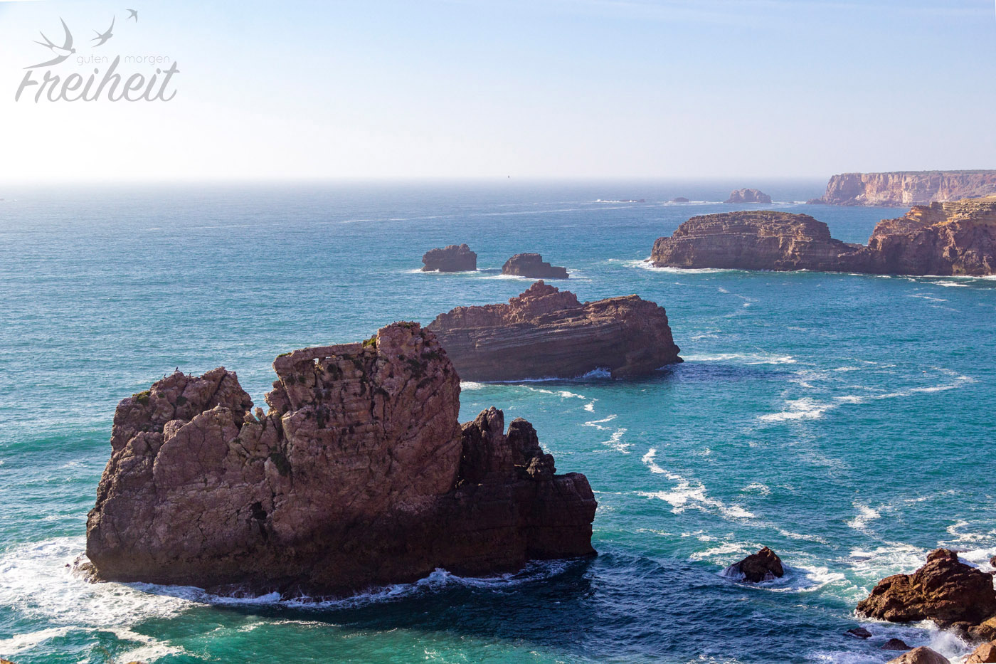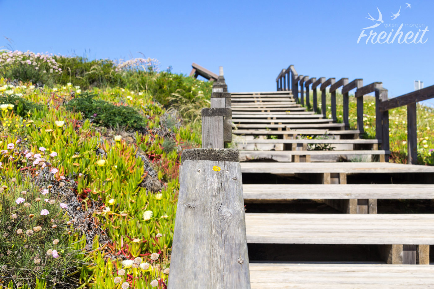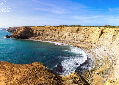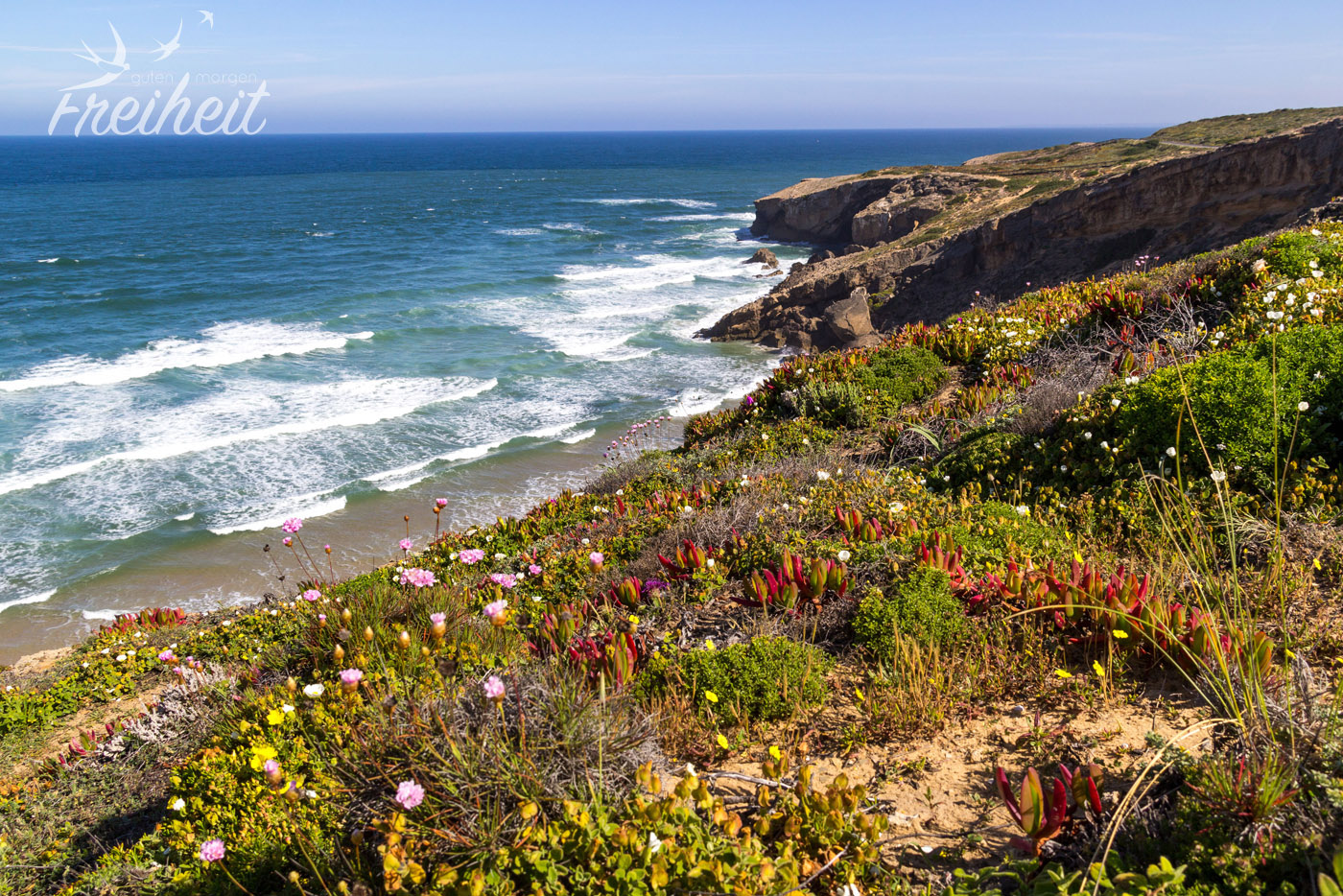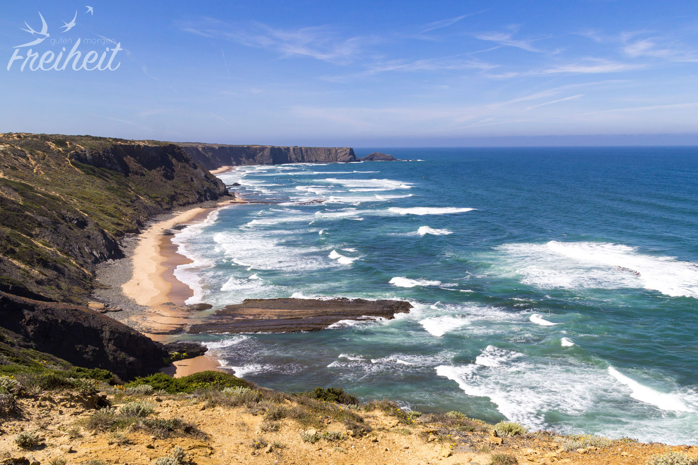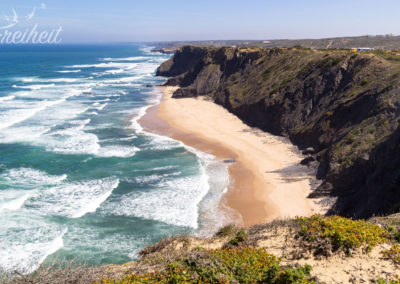 Wer der Straße vom Praia do Amado aus in nördlicher Richtung entlang der Küste folgt, kommt nach einigen Minuten automatisch auf eine Schotterpiste, die um ein Kap herum bis zum Praia da Bordeira führt. Ein Strand, zu dem wir gleich noch kommen. Auf dem Weg dahin gibt es zahlreiche kleine Parkbuchten und jede Menge Aussichtspunkte, die man oft über Holzstege erreicht. Von dort eröffnen sich immer wieder neue Blicke auf die Steilküste und den Atlantik. Es lohnt sich ab und an mal den Wagen stehen zu lassen und ein bisschen spazieren zu gehen.