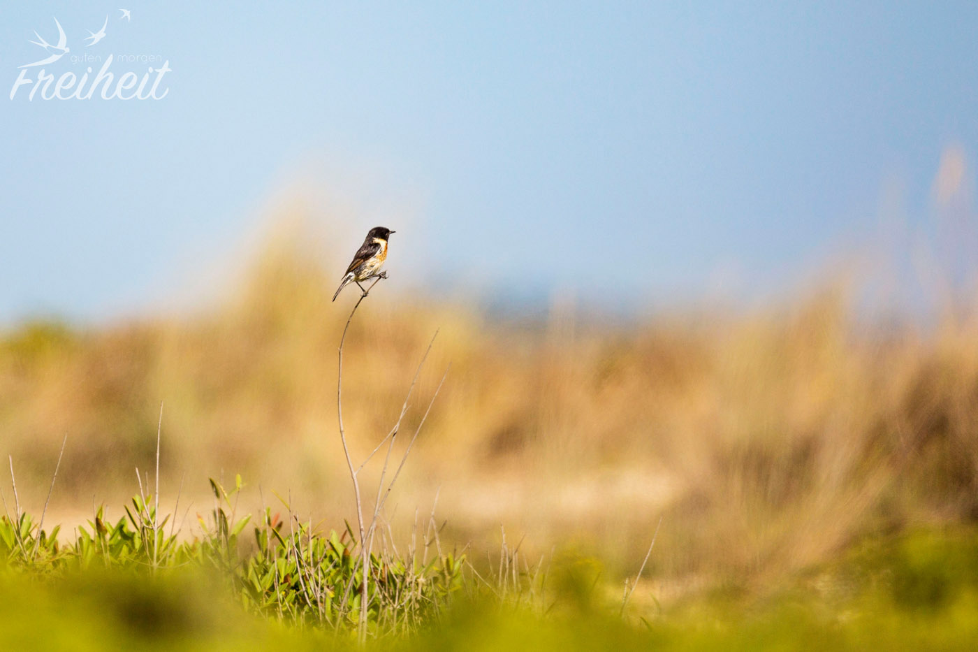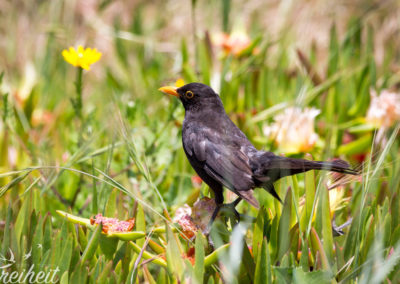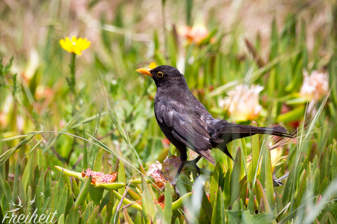 Der Abschluss unseres heutigen Tages führt uns auf eine Schotterstraße, die südlich hinter Monte Clérigo beginnt und direkt an den Steilklippen verläuft. Nach ein paar hundert Metern stellen wir den Wagen in einer der Parkbuchten ab und schauen uns zu Fuß ein wenig um. Zwar sehen wir auch schöne Strandbuchten, nur der Zugang ist entweder sehr sportlich oder einfach nicht möglich, da viel zu steil 😛 Aber das Spazieren entlang der Klippen wird uns eh nicht langweilig, besonders bei der vielfältigen Fauna. Und ein paar süße Vögel kriegen wir auch noch vor die Linse 🙂