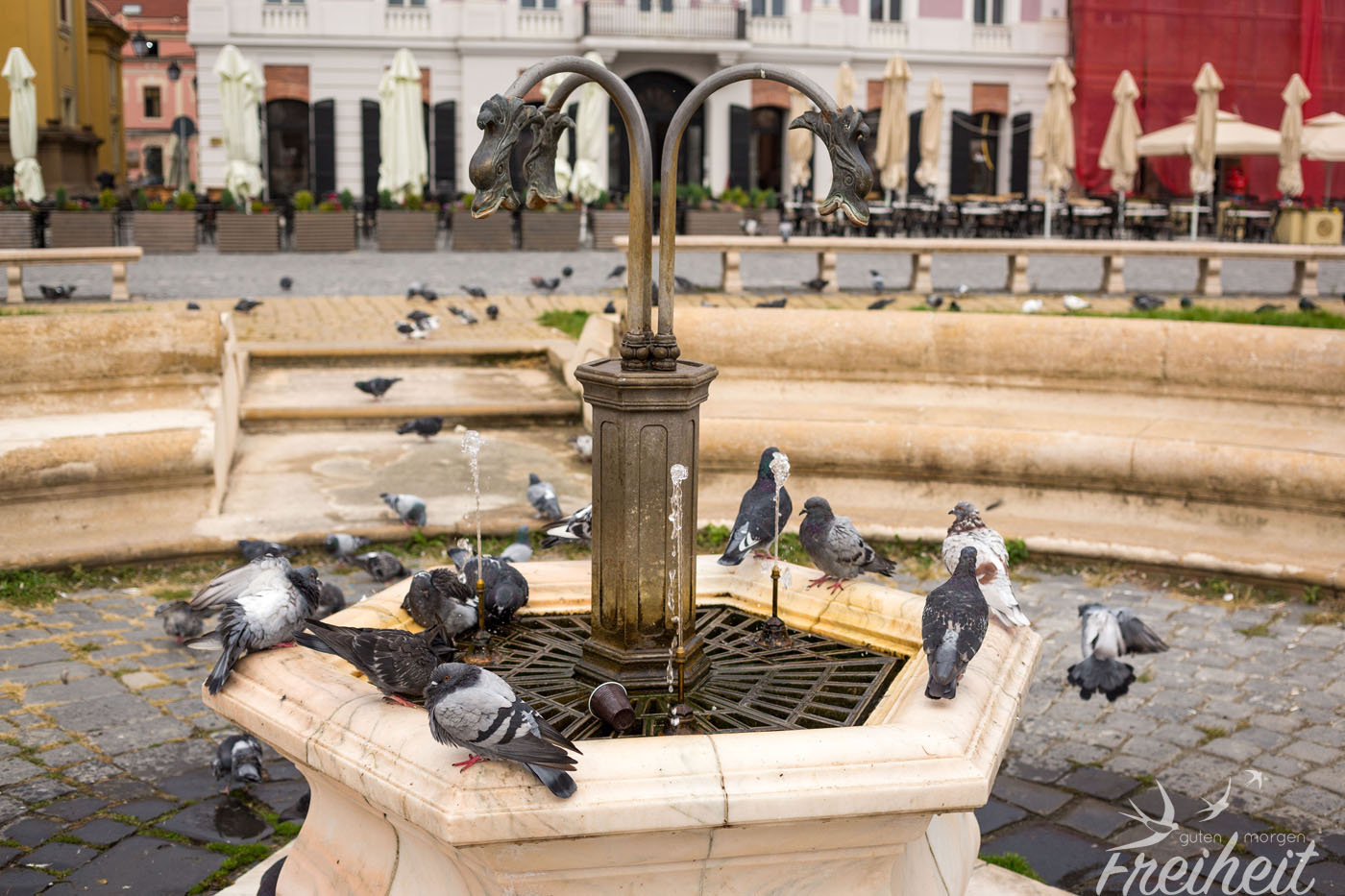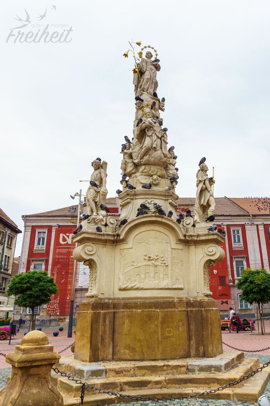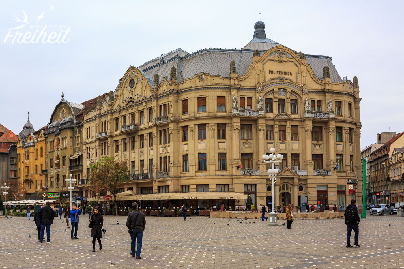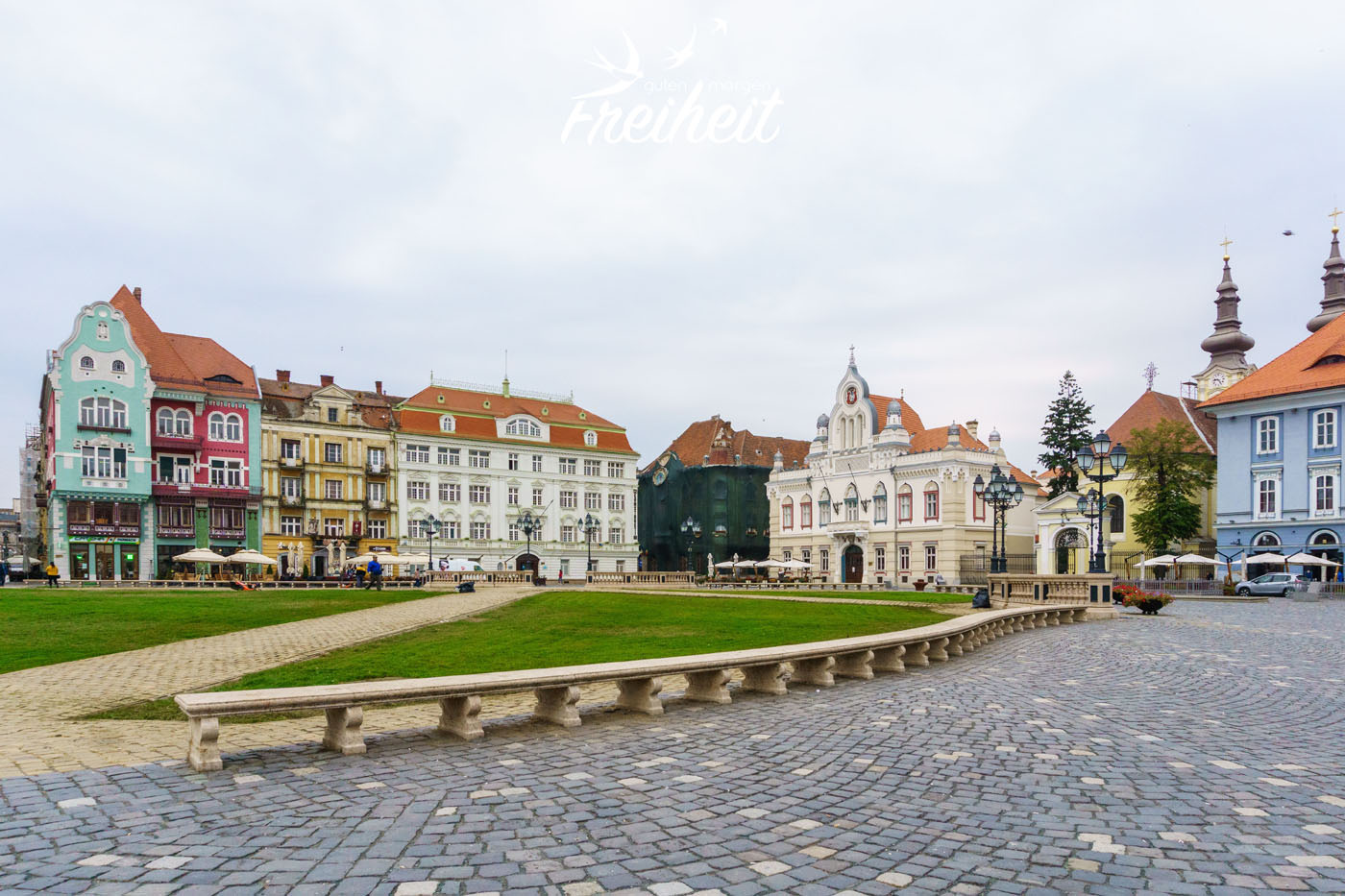 2. Oktober – und wir feiern unseren dritten Hochzeitstag 😀 Leider ist es auch heute grau und etwas nebelig, aber immerhin ohne Regen. Timișoara gehörte früher zum Kaiserreich Österreich-Ungarn und nimmt durch die lange Zugehörigkeit und Prägung viele Bauten, Kirchen und Palais aus dieser Zeit mit. Über 14.000 historische Gebäude zählt Timișoara insgesamt. Klein-Wien wird die Stadt deshalb auch gerne genannt. Schon der erste Platz überrascht uns total. Wir hätten nie damit gerechnet, dass Timișoara so eine hübsche Altstadt hat.