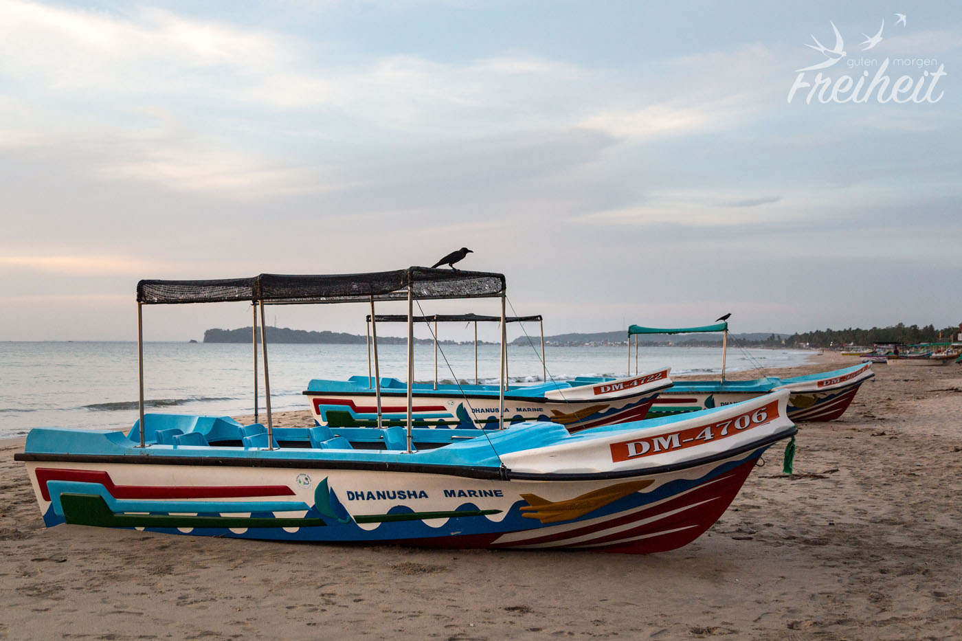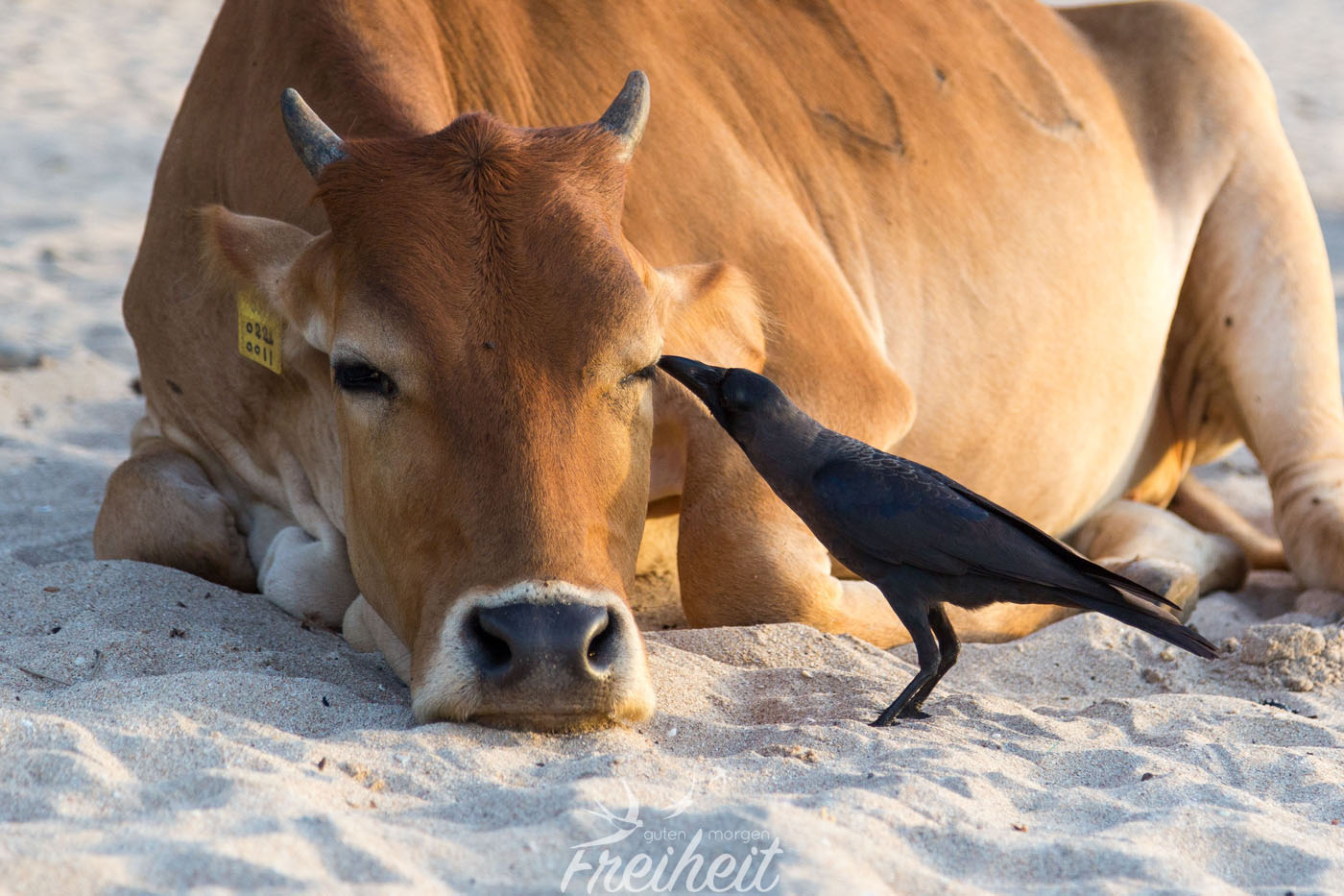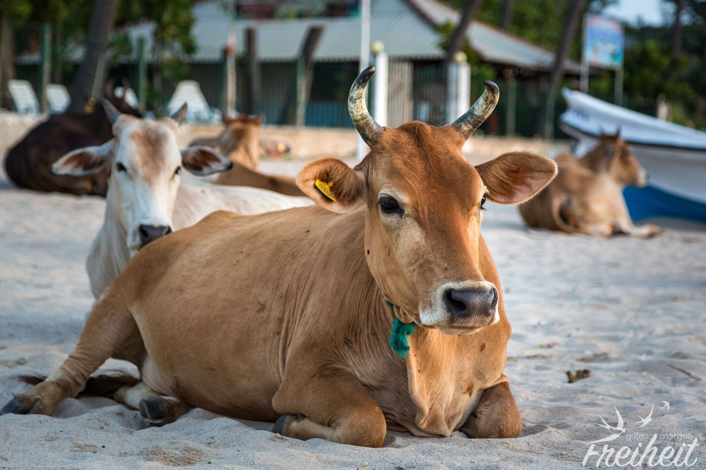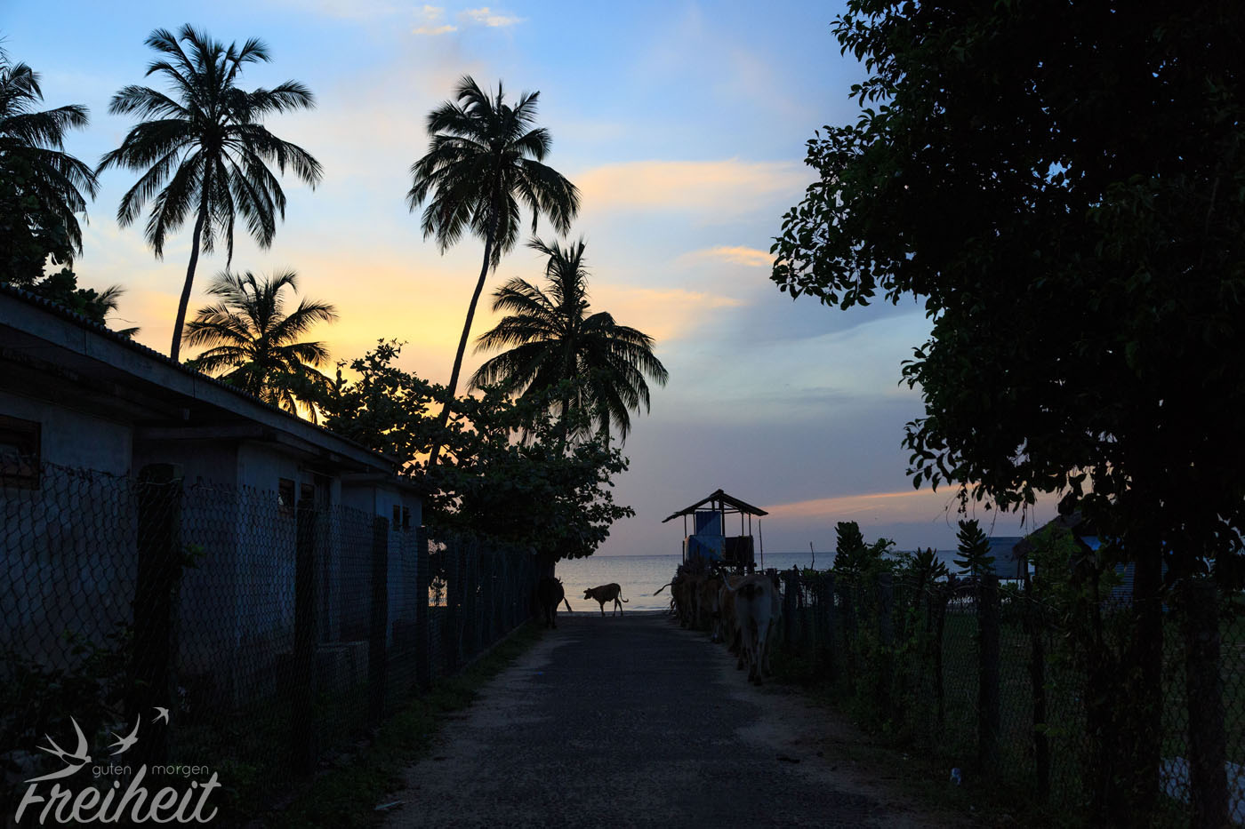 Pünktlich zum Sonnenaufgang sind wir am Strand und geniessen die kühle Luft (28 Grad ;-)) und die ersten Besucher. Es sind vor allem Kühe, Hunde und Raben, die an den Kühen herumpicken. Ohren, Nasen und sogar die Auge werden gereinigt. Schaut echt krass aus. Wir beschliessen einen Entspannungstag einzulegen. Mein Rücken hat nach der Speed Bootfahrt eine Pause verdient.