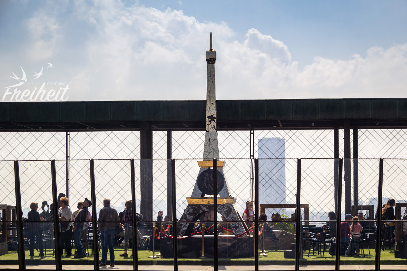Wir erreichen die erste Plattform in rund 58m Höhe. Noch ist wenig los. Von den 3000 potenziellen Besuchern, die sich hier aufhalten können sind erst hundert angekommen. Schnell drehen wir unsere erste Runde und machen uns weiter auf den Weg zur zweiten Etage bevor es voller wird. Stufe um Stufe verbessert sich der Ausblick und langsam kommen sich alle vier Pfeiler näher. Nach 704 Stufen erreichen wir die zweite Plattform in 115,7m Höhe auf der immer noch 1600 Besucher Platz finden können. Nun geht es auch für uns mit dem Fahrstuhl weiter. Die Zugangskonstruktion verheisst reichlich anstehende Gäste, doch aktuell können wir noch direkt bis zur Fahrstuhltür vorgehen und gleich hinauffahren. Auf der dritten Etage angekommen befinden wir uns auf 276m und die Außenwände sind verglast. Doch es geht noch ein paar Stufen weiter hoch auf die oberste Aussichtsplattform mit freiem Blick, inklusive einer Höhenanzeige, Eiffels Büro und vermutlich der kleinsten und höchsten Champagner-Bar Frankreichs. Also die Bar ist eigentlich nur ein Champagner-Micro-Kiosk, aber wir sind eben in Frankreich und da gilt, Hauptsache Champagner und Blick auf Paris 😉 Wir bleiben lieber nüchtern und sparen uns das Geld für eine spätere richtig geniale Gaumenfreude der besonderen Art – Einzelheiten folgen 😉