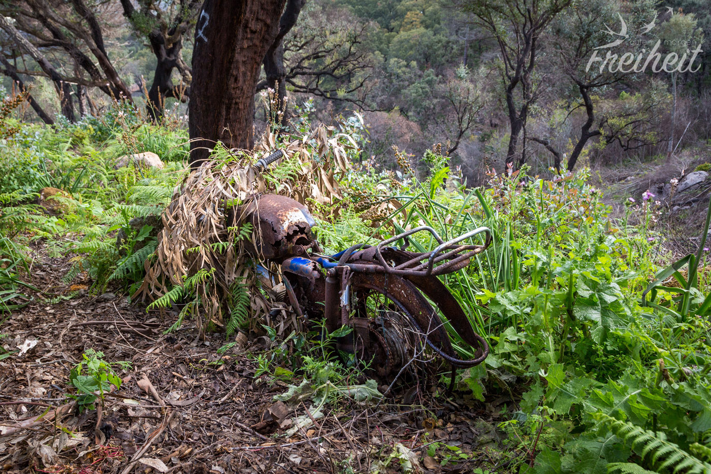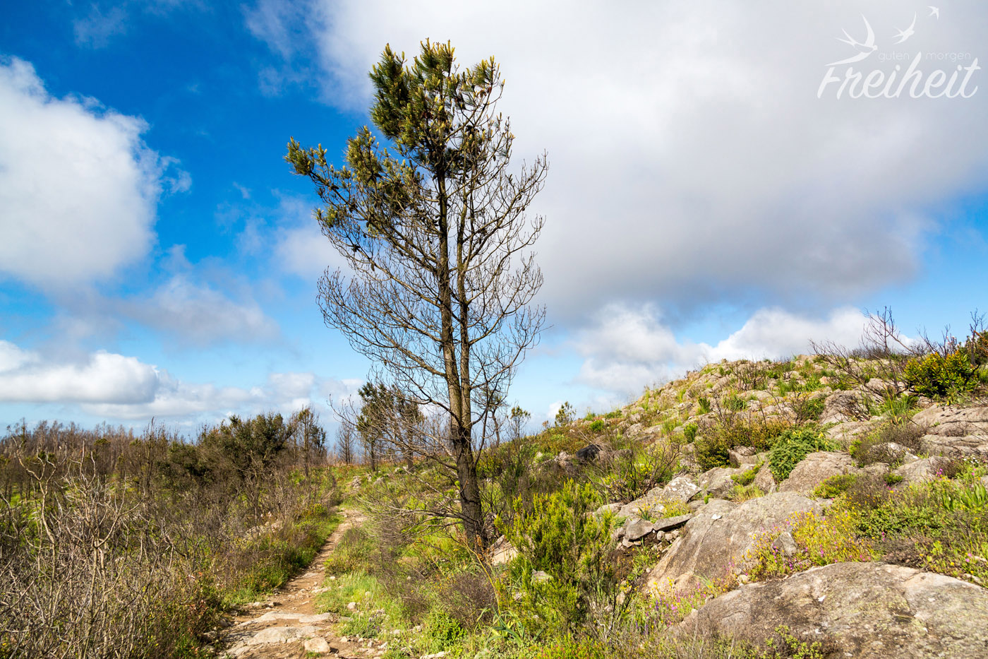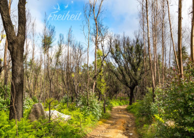 Der Nordwesten der Algarve ist Heimat des Gebirges Serra de Monchique mit dem Fóia (902m) als höchsten Berg. Die Serrra ist der Wetterfänger für die Südküste Portugals und sorgt dafür, dass sich der Regen aus dem Norden über den Bergen staut und schließlich abregnet. Gepaart mit den warmen Temperaturen entwickelte sich hier eine sehr hohe Artenvielfalt. Dank des Sandstein-Schiefer Gemischs, aus dem die Serra hauptsächlich besteht, gelangen die Gebirgsflüsse bis an die Küste und versorgt die Südalgarve mit Wasser. Trotz des feuchten Wetters im Winter, kommt es im Sommer immer wieder zu verherenden Waldbränden, die viele alte Wälder mit Korkeichen, Walnussbäumen und Kastanien bedrohen. So auch 2018. Erst nach einer Woche konnte der Brand gelöscht werden. Auf dem Weg zu unserem Wanderstartpunkt konnten wir die schwarzen, verkohlten Überreste sehen.