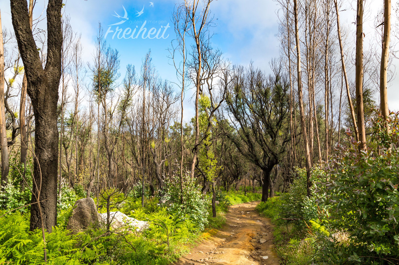 Wir haben uns inzwischen warm gelaufen und haben nach kurzen Wegfindungsproblemen wieder den richtigen Pfad gefunden. Ein Korkeichenwald wechselt in den nächsten bis es sich schließlich lichtet und wir unter einem jungen Eukalyptuswald wandeln. Schön anzusehen, wie die dünnen Stämme in die Höhe wachsen und sich im Wind wiegen.