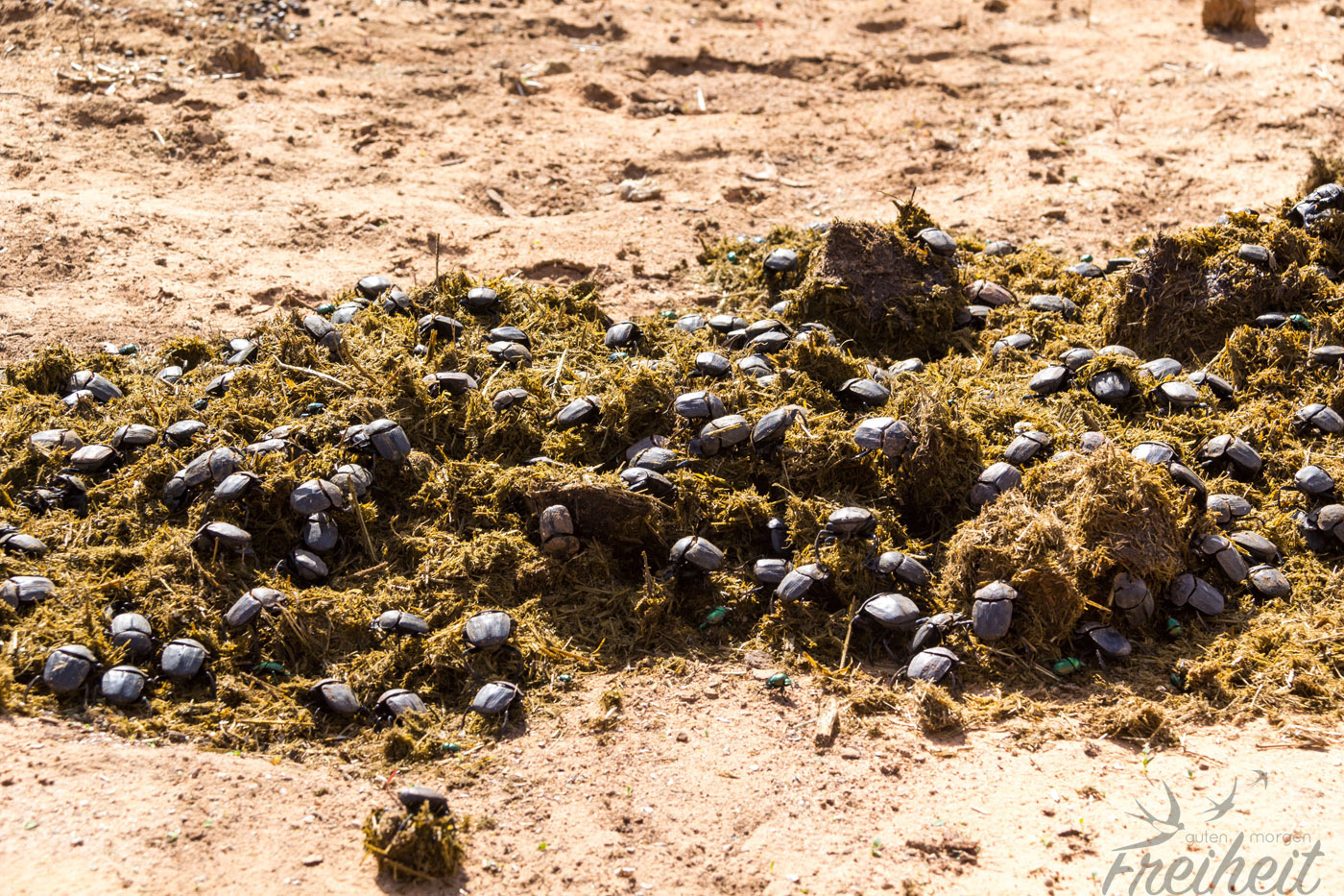 Doch vor den Erlebnissen am Waterberg stehen rund 400 Kilometer mit dem Wagen an. Wir starten von der Harnas Wildlife Foundation und fahren auf Sandpisten mit reichlich Dung und Mistkäfern, die sich auf selbe stürzen 😉 Schon bald kommen wir auf geteerte Straßen, holen am Seitenstreifen unseren Kompressor raus und steigen gleich wieder ein, bevor tausende von Ameisen über uns herfallen. Eigentlich fürchten wir uns nicht vor Ameisen, aber wow, die hier sind echt schnell und gehen gleich zum bissigen Angriff über. Also schnell die Ameisen abklopfen und zurück ins Auto. Auf dem nächsten freien Platz können wir dann unsere Reifen mit dem richtigen Reifendruck versorgen und machen auch gleich eine kleine Brotzeit 🙂