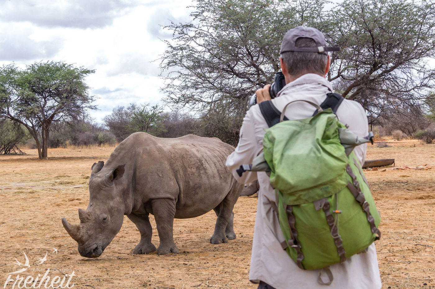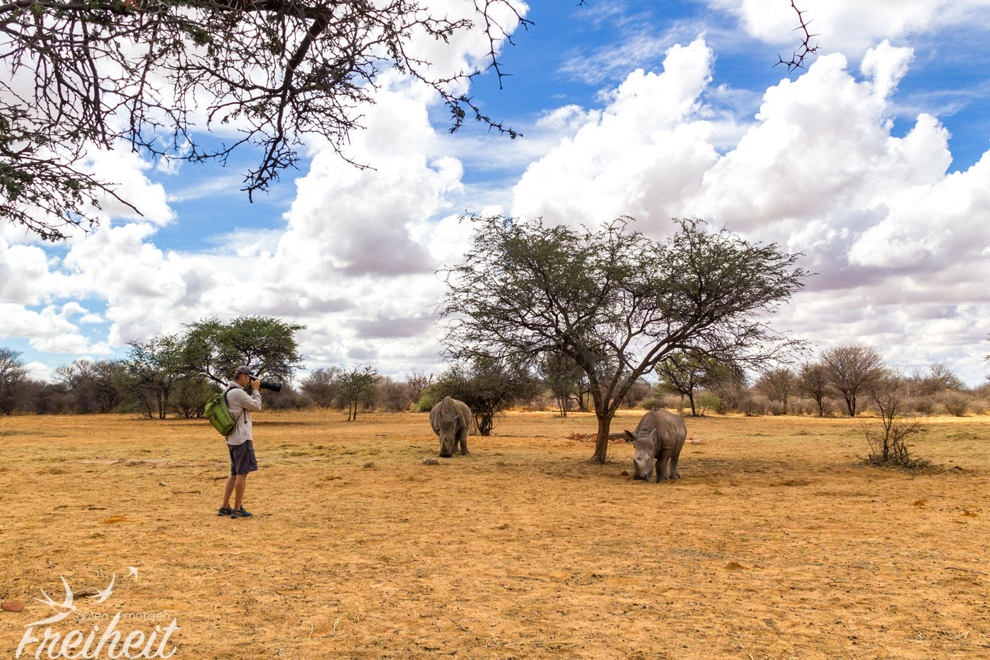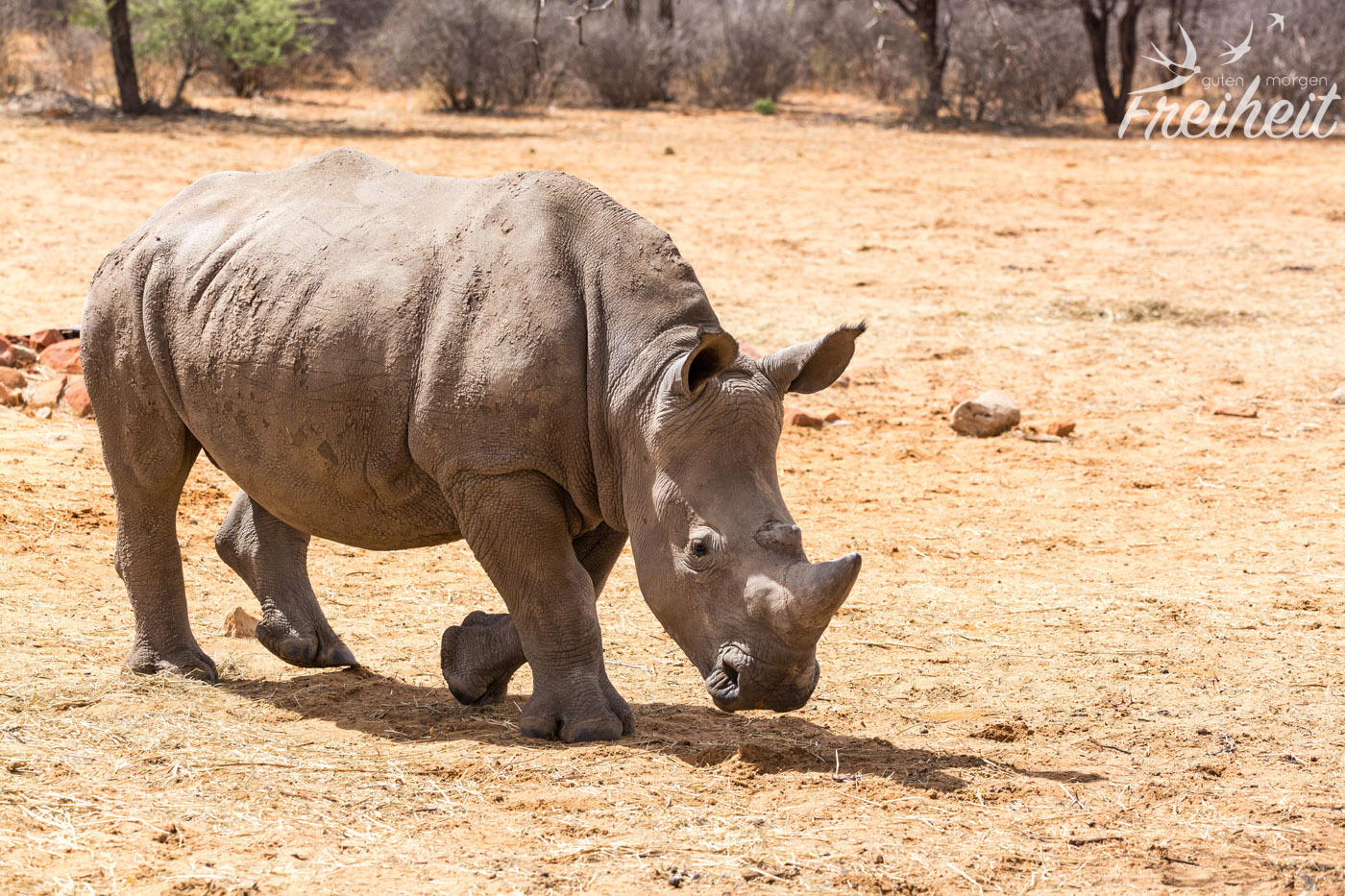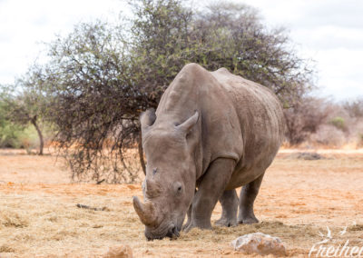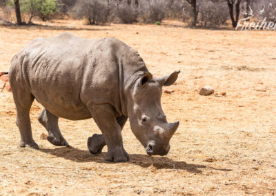 Der nächste Morgen beginnt für uns mit einer Wanderung durch das Naturreservat mit der Hoffnung auf eine Begegnung mit Breitmaul-Nashörnern. Es ist acht Uhr morgens und schon schnell zeigt die Sonne ihre Kraft. Unser Guide führt uns schnellen Schrittes in Richtung Futterstelle der Nashörner. In der Trockenzeit ist es wichtig die Tiere zu füttern, da sie nicht genügend Nahrung in ihrer Umgebung vorfinden. Unser Guide ist zügig unterwegs und wir versuchen quasi im Vorbeilaufen noch ein paar Fotos von der Umgebung zu machen. Die Erde ist sehr ausgetrocknet und die wenigen Tierspuren, die wir sehen werden uns leider nicht erklärt.