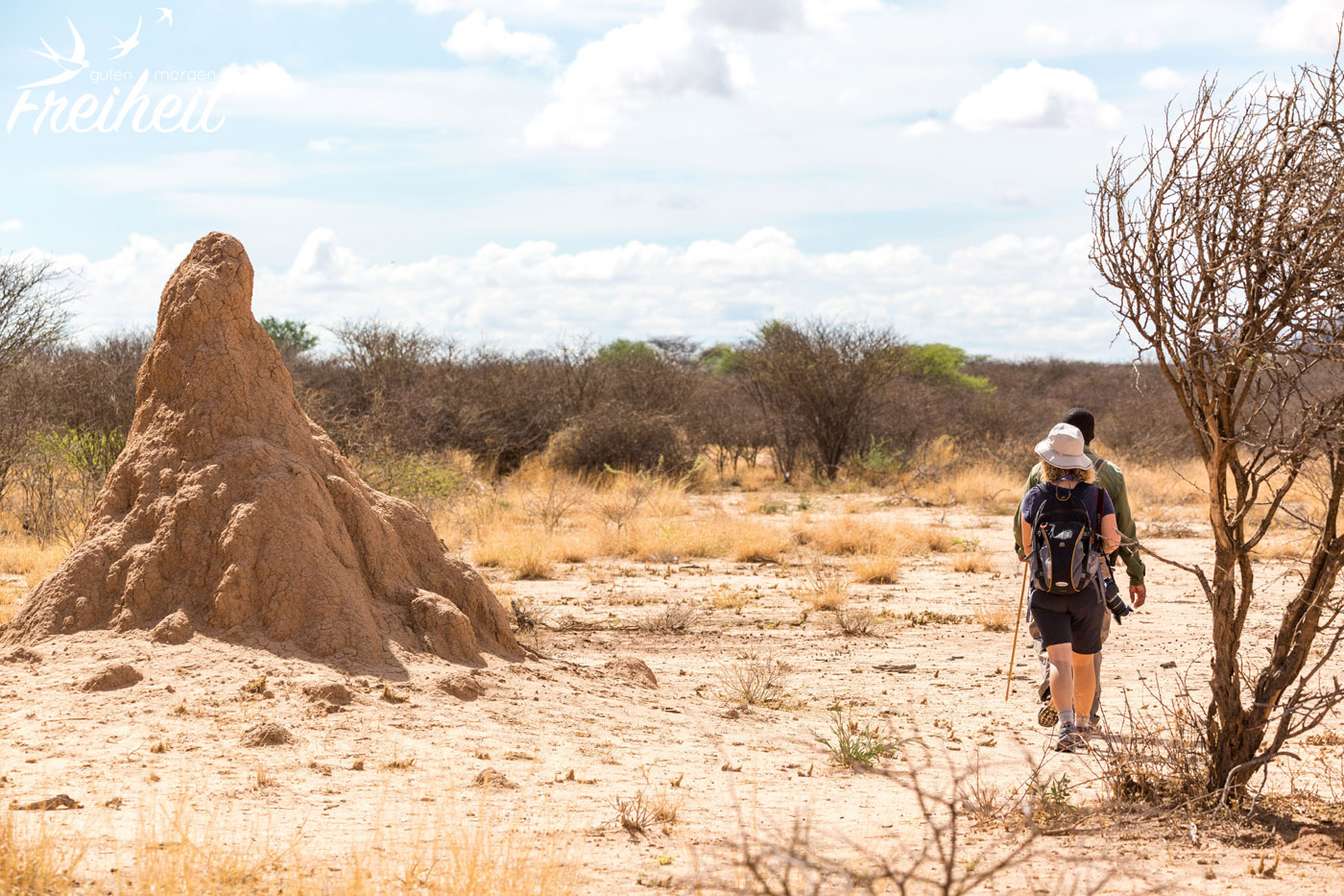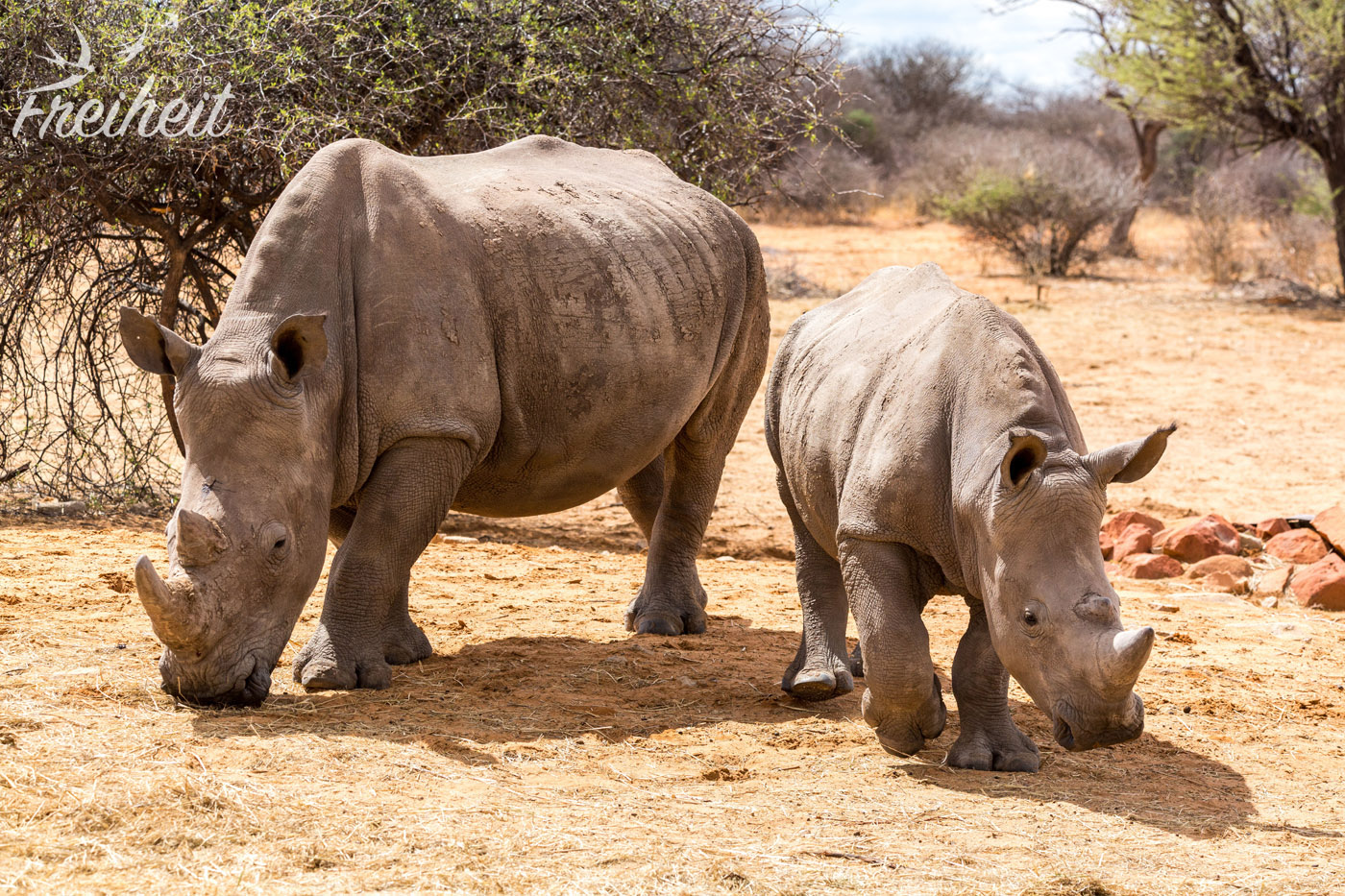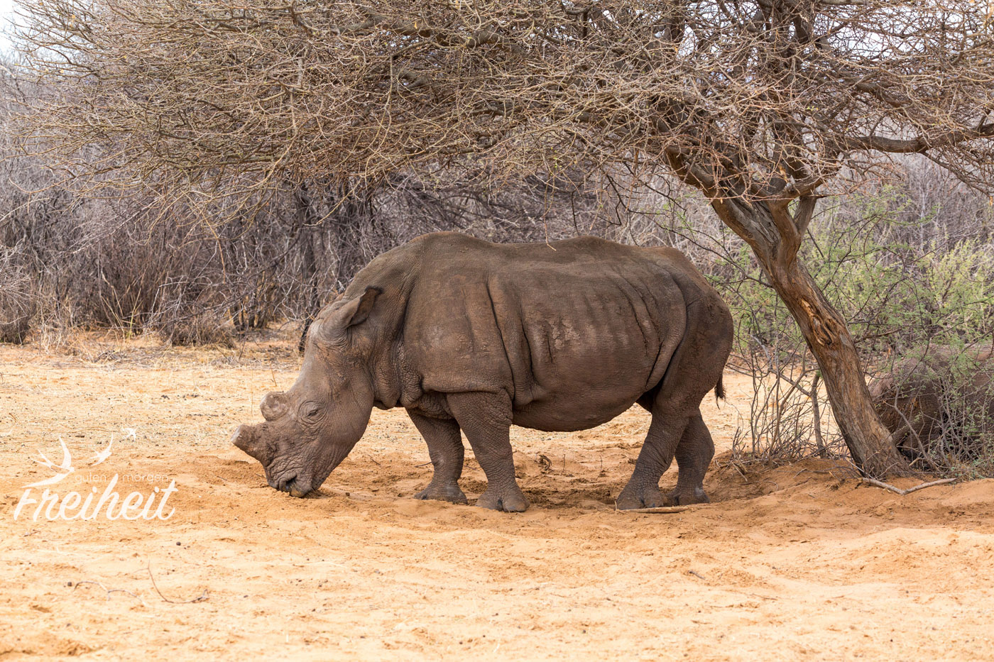 Der nächste Morgen beginnt für uns mit einer Wanderung durch das Naturreservat mit der Hoffnung auf eine Begegnung mit Breitmaul-Nashörnern. Es ist acht Uhr morgens und schon schnell zeigt die Sonne ihre Kraft. Unser Guide führt uns schnellen Schrittes in Richtung Futterstelle der Nashörner. In der Trockenzeit ist es wichtig die Tiere zu füttern, da sie nicht genügend Nahrung in ihrer Umgebung vorfinden. Unser Guide ist zügig unterwegs und wir versuchen quasi im Vorbeilaufen noch ein paar Fotos von der Umgebung zu machen. Die Erde ist sehr ausgetrocknet und die wenigen Tierspuren, die wir sehen werden uns leider nicht erklärt.