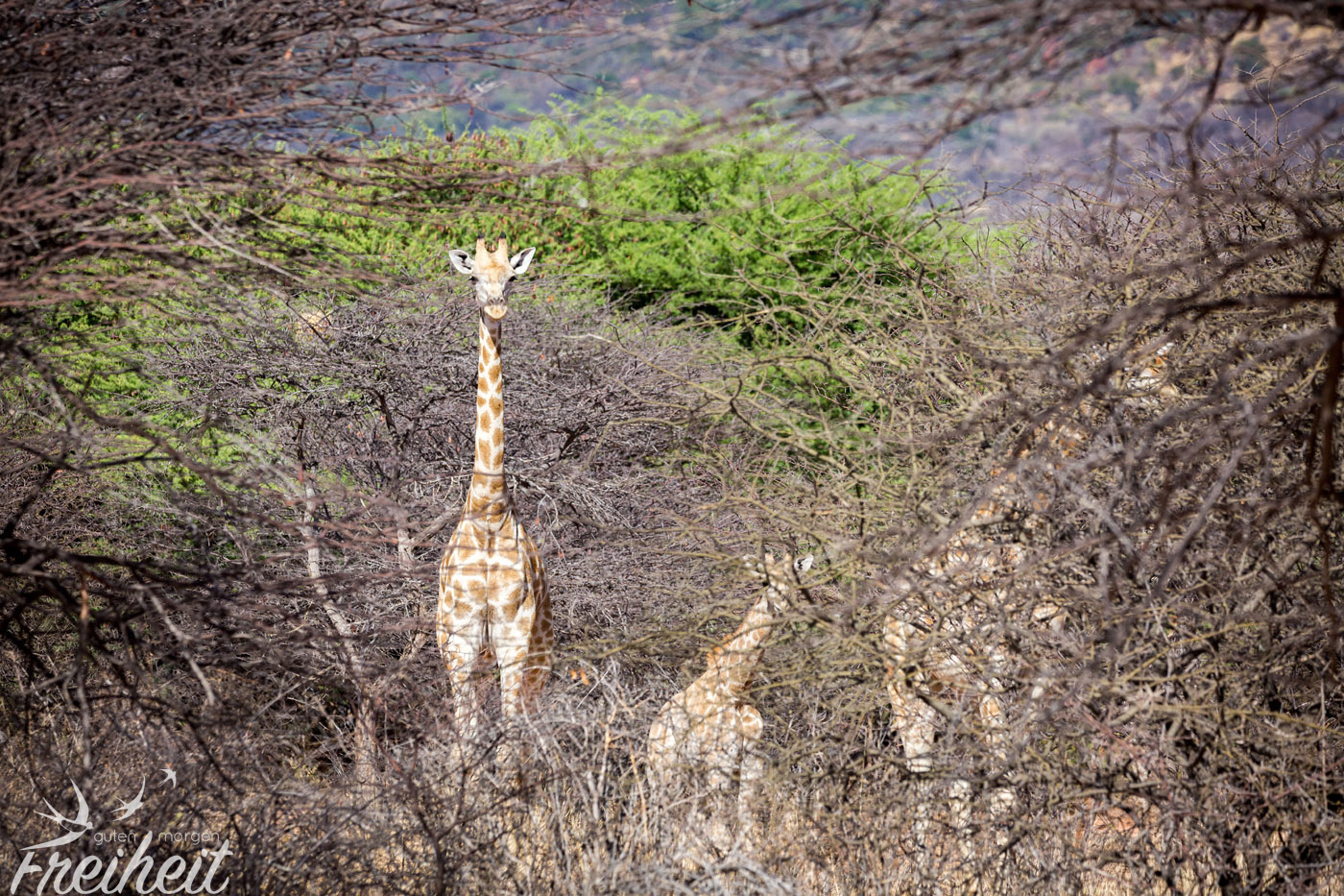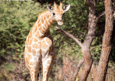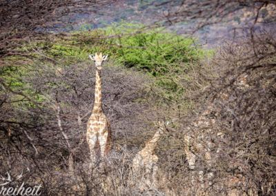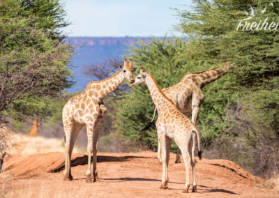 Aber was sind schon Tierspuren, wenn plötzlich mehrere Giraffen auftauchen? Erst sehen wir nur Köpfe zwischen den Baumwipfeln und dann kommen sie heraus auf die freie Fläche. Mega schön! Zwei junge Giraffen messen ihre Kräfte in dem sie mit ihrem Hälsen ringen und andere kommen ein wenig näher und futtern fleißig weiter. Unser Guide ist mit dem Abstand zufrieden und näher liessen sie uns vor allem mit dem Nachwuchs nicht heran. Zu Fuss ist es ein noch beeindruckenderes Erlebnis als aus dem Auto heraus.