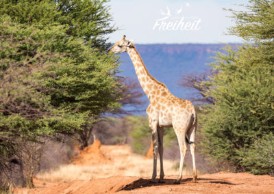 Für die letzten Kilometer lassen wir wieder Reifenluft ab und ehe wir an der Campsite ankommen wartet noch eine kleine Überraschung auf uns. Die Sandpiste ist teilweise vom Regenwasser unterspült und riesige metertiefe Risse lassen uns immer wieder die Fahrbahnseite wechseln. Wir haben keine Fotos davon, wollten wir doch lieber diese Passagen schnell hinter uns lassen und unsere Aufmerksamkeit dem schönen Tafelberg „Waterberg“ widmen. 50 Kilometer lang und 16 Kilometerbreit steht er mit seinen 200 Meter hohen Flanken vor uns. Rote Felswände umgeben von riesigen grünen Tälern. Den Namen verdankt er den oft hängenbleibenden Regenwolken und den resultierenden Niederschlägen, die die Umgebung mit Wasser versorgen.