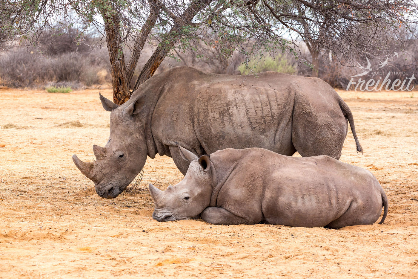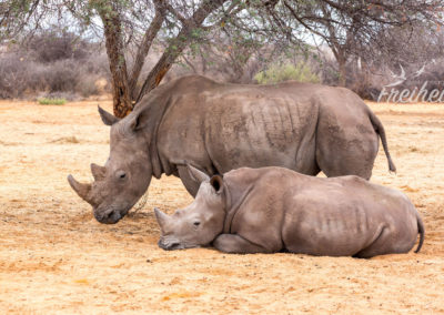 Hier noch ein paar spannende Fakten: Ihre Haut ist 2cm dick, die Kälber wiegen bei der Geburt nach 16-18 monatiger Tragzeit 40-60kg und bereits nach einem Jahr schon um die 440kg! Aber auch abgesehen von der imponierenden Masse haben Breitmaul-Nashörner auch eine imponierende Anzahl von Lauten zur Verfügung, die sich aus ihren engen sozialen Beziehungen entwickelt haben. Normalerweise leben die Weibchen mit ihrem Nachwuchs und weiteren Weibchen in einer Gruppe von 5-6 Tieren und haben ein kilometerweit reichendes Gebiet für diesen Verbund. (Weitere Infos zu Nashörnern und anderen tollen Tieren findest Du hier)